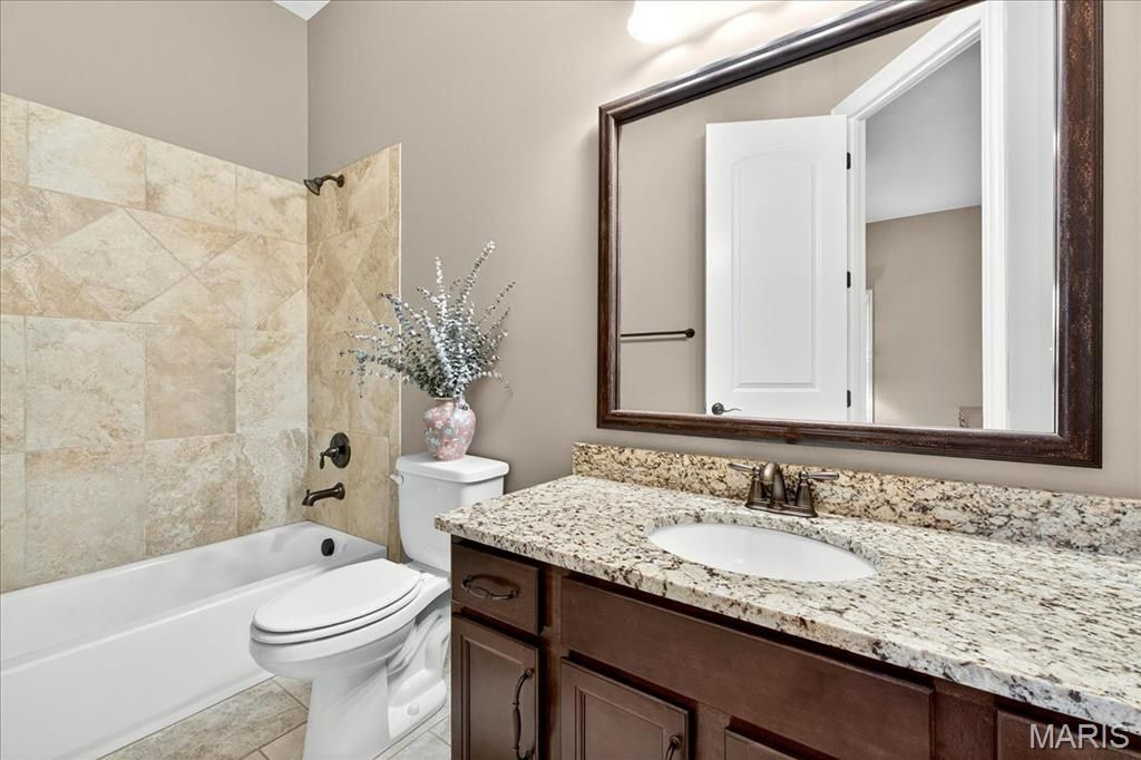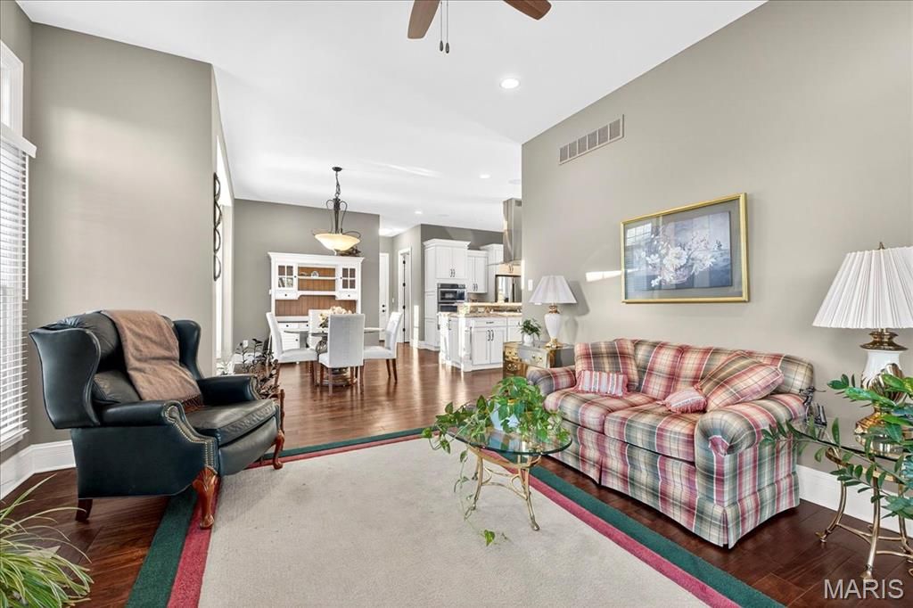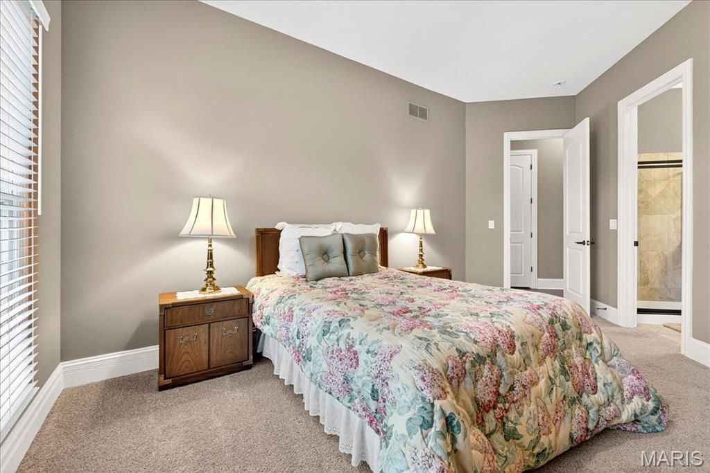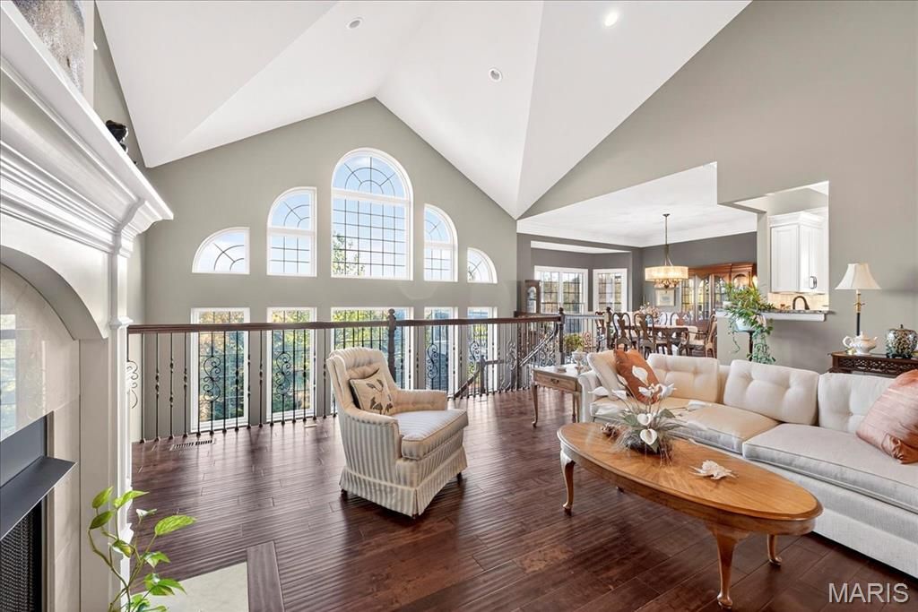 Stunning Atrium Ranch located in The Arbors at Kehrs Mill, showcasing thoughtful details and custom touches throughout! Set on a spacious ½-acre fenced lot, perfect for a future pool, this 5-bedroom, 5.5-bath home offers over 4,700 sq. ft. of finished living space. The exterior features an inviting blend of brick and stone. Inside, gleaming wood floors flow through the main living areas, leading to a light-filled great room with soaring windows, gas fireplace, built-ins, and an elegant iron-spindle staircase. A formal dining room with bay window adds timeless charm. The gourmet kitchen boasts custom cabinetry, stainless steel appliances, granite counters, a breakfast bar, and an adjoining breakfast room with bay window. A cozy hearth room with gas fireplace and triple French doors opens to a screened-in porch and deck, perfect for entertaining or unwinding. The primary suite offers a coffered ceiling with crown molding, a spa-inspired bath with dual vanities, jetted tub, a separate walk-in shower, and generous walk-in closets. Two additional bedrooms, 2.5 baths, and a laundry room complete the main level. The finished walkout lower level includes a spacious rec room, a custom walk-behind wet bar, two more bedrooms, and two full baths. Extras include a central vacuum system, 3-car side-entry garage, covered patio, irrigation system, and more!