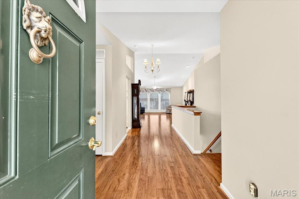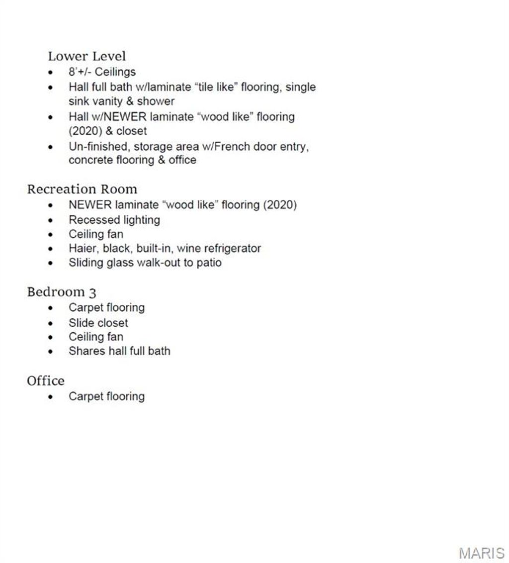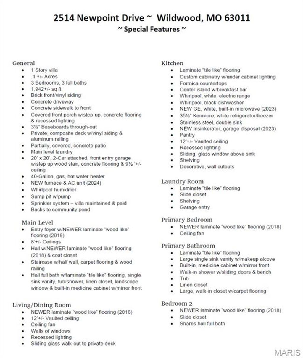 Lovely 3 bedroom, 3 full bath villa offering 1,942+/- sqft located in the highly desirable Wildwood area! Covered front porch welcomes you as you step inside the entry foyer. NEWER laminate "wood like" flooring through-out most of home. The spacious living/dining room combo boasts an expansive 12' vaulted ceiling, walls of windows allowing plenty of natural light & sliding glass door to a private composite deck overlooking the beautiful/peaceful community pond. Kitchen offers laminate "tile like" flooring, custom cabinetry, center island, 12' vaulted ceiling & pantry. Primary suite features a ceiling fan, large single sink vanity w/makeup alcove, shower, tub & large walk-in closet. 2nd Bedroom with slide closet & shares hall full bath. Laundry room completes main level. Lower level extends living quarters with a rec room w/recessed lighting, built-in wine fridge & sliding glass walk-out to patio, 3rd bedroom w/carpet & slide closet share hall full bath, office & unfinished storage area w/French door entry. Outdoors, one will enjoy a level backyard with a partially covered concrete patio & 2-Car attached garage. Within the Rockwood School District w/walking distance access to Hwy 100/Manchester Rd, shopping, dining, & Wildwood amenities. Must see!