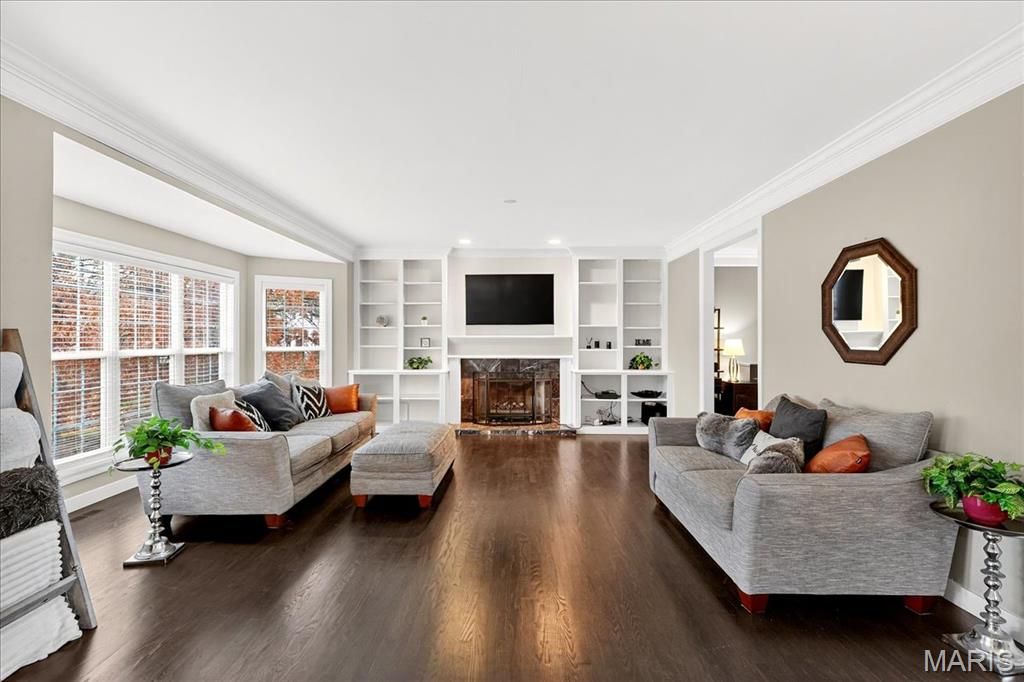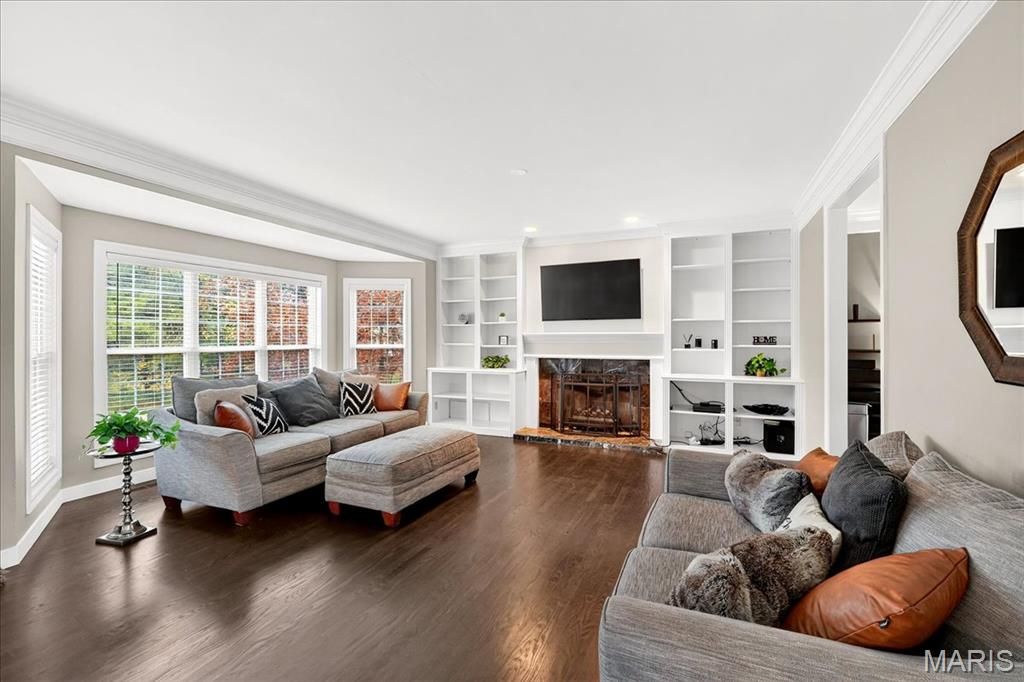 Welcome to this two story home on a level lot in a quiet pocket of the neighborhood. The two story foyer leads to an office with French doors on the right and a dining room on the left. The office opens to a bright family room with a gas fireplace, crown molding, and bay windows with a clear view of the three season room and backyard. The main level includes gleaming hardwood floors, a powder room, a laundry and mudroom area, and a kitchen with granite countertops, a large breakfast room, and a reading nook. Upstairs are four bedrooms with plush carpet. The primary suite has vaulted ceilings, two closets, a separate tub and shower, and dual vanities. Two bedrooms share a Jack and Jill bath with double sinks, and the fourth bedroom has its own full bath. The lower level offers a huge rec room, an enclosed gym, a wet bar, and plenty of storage. The backyard is level and easy to use. Additional features include a three car garage, nine foot ceilings, and a hardwired Level 2 Tesla Wall Connector"”providing up to 44 miles of range per hour and included with the home.