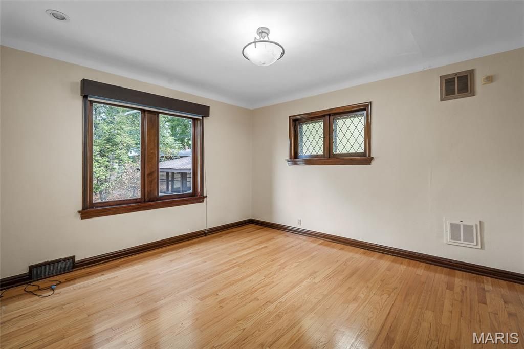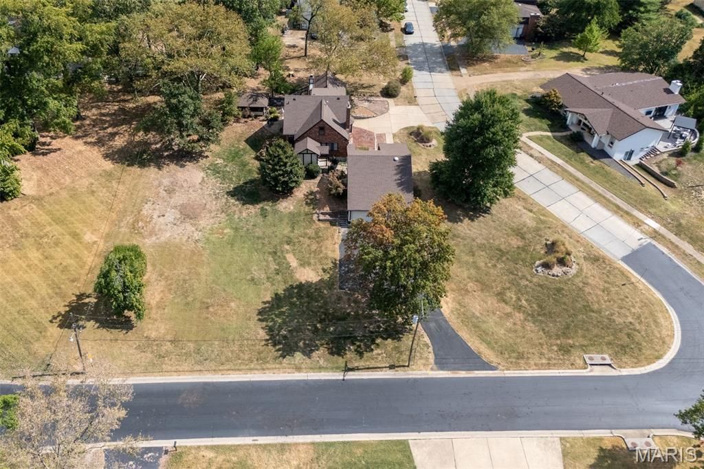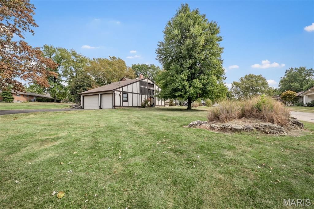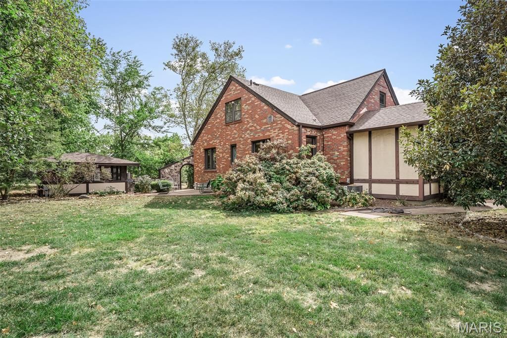 Fabulous location and NEW price! Unique - 1 of a kind, custom brick home on almost ONE acre level lot in prime Sunset Hills and Lindbergh Schools. This 4+bedroom, 4 bath was custom built and features lots of charm. The entrance greets you with a serene covered courtyard, pond and walkway. The main level includes hardwood floors throughout, spacious formal living room with fireplace, formal dining room, oversized family room with stone fireplace and accents, kitchen, full bath and a fairly open floor plan with 2 bedrooms, one being used an an office. The kitchen has stainless appliances, solid surface counters, custom oak cabinetry, pantry and lots of storage. Built in bookcases, coved ceilings, arched doorways, ceramic tile foyer, hardwood floors, stained glass windows, recessed lighting and more. The second floor boasts 3 bedrooms, 2 with en-suites/full baths. The partially finished lower level has more built in bookcases, large recreation room, separate bar area, laundry room, full bath, workshop and plenty of dry storage. There is a one car tuck under garage attached, and a 3 car semi attached garage with lots of additional garage attic storage. The french door leading from the family room takes you to the back porch and patio with built in grills, 'summer house'/screened porch and expansive level yard. This home sits on a giant level quiet corner lot, 2 driveways, cul de sac, with tons of potential. Seller is selling AS-IS. Tons of potential to make this your own!