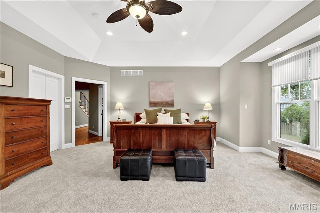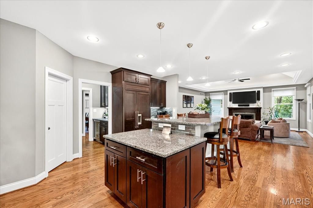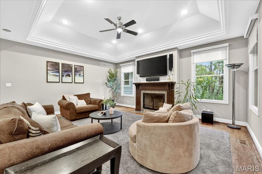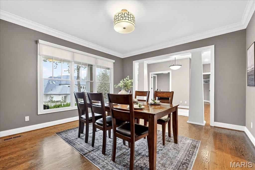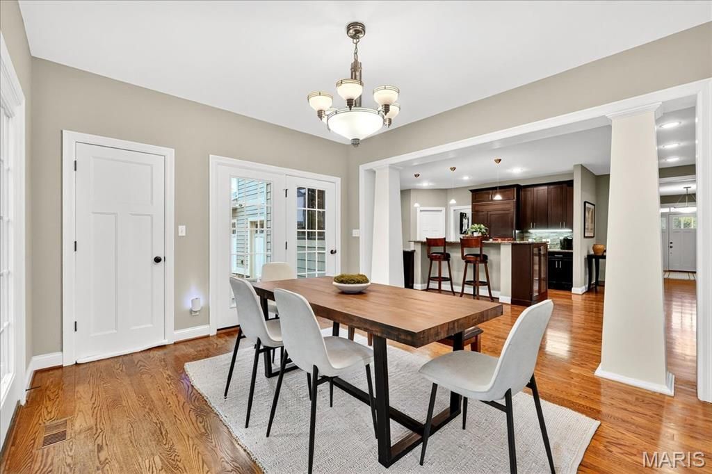 Experience refined living in the heart of Kirkwood. Ideally situated near Kirkwood Park, Pool, & the vibrant boutiques & restaurants of downtown, this exquisite residence rests on a serene half-acre, wooded lot in coveted Sugar Creek. With over 5,400 square feet of sophisticated design! Every detail has been thoughtfully curated to blend timeless elegance with modern comfort. The exterior boasts James Hardie cement siding and a discreet rear-entry three-car garage, setting the tone for the craftsmanship within. A gourmet chef's kitchen serves as the home's centerpiece, featuring granite surfaces, custom 42-inch cabinetry, a butler's pantry, & a suite of premium KitchenAid & Viking appl, including a gas cooktop, rangehood, double ovens & built in refrigerator. The sunlit breakfast rm, wrapped in windows, opens seamlessly to covered deck, creating effortless indoor-outdoor flow. Retreat to the luxurious main level primary suite, where coffered ceilings, dual raised vanities, a soaking tub, & a walk-in shower invite moments of relaxation. Distinctive architectural touches-gleaming hardwood floors, French doors, stately columns, & full masonry gas fireplace enhance the home's grandeur. The upper level offers 3 beds & 3 full baths & bonus rm, while the finished LL extends the living space w/ a theater/rec rm, guest suite, full bth, & abundant storage. Designed for both grand entertaining & everyday comfort, this home captures the essence of upscale living.