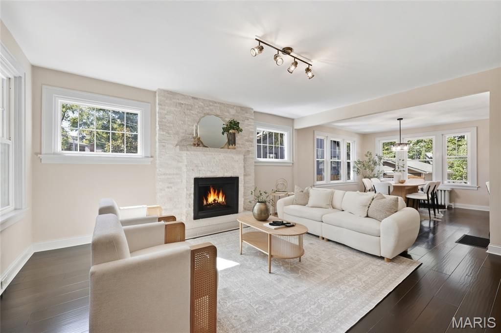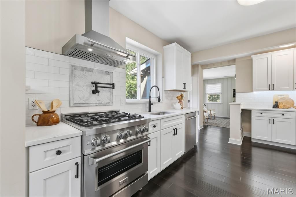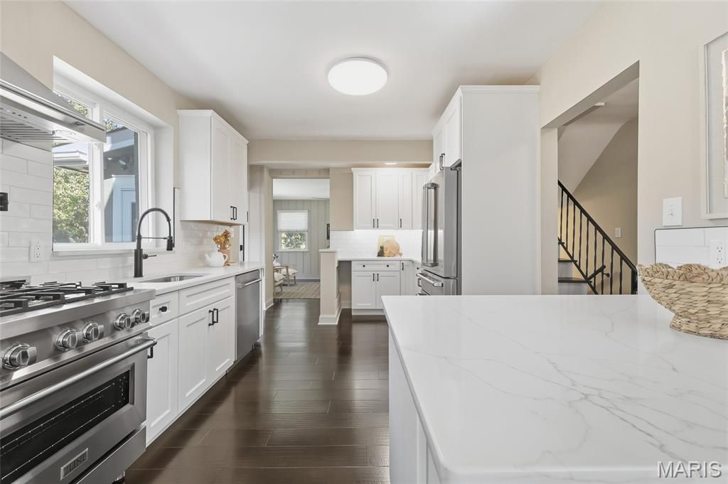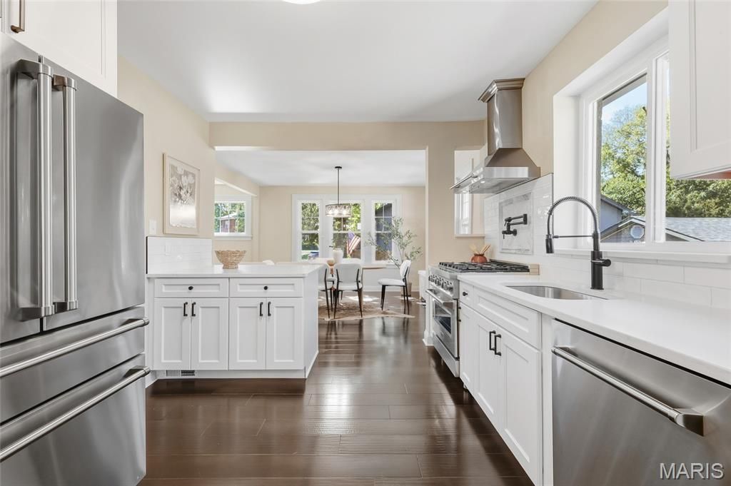 OPEN FRIDAY 5-7PM - Be wowed by this charming craftsman-style home in Webster Groves with an outstanding location featuring a POOL, main floor primary bedroom, stunning kitchen & so much living space! The inviting living room with fireplace and gorgeous flooring flows seamlessly into the formal dining room, perfect for entertaining. Opening up to heart of the home - this flawless kitchen features all new stainless steel appliances, gas range and pot filler, custom cabinetry and beautiful quartz countertops. Enjoy views to to your backyard oasis from the spacious family room located off of the kitchen. Additionally, you have another sitting/ bonus room/ den/office space on lower section that overlooks your front yard. This main level also features a full bath with a shower & tub and double vanity as well as a main floor primary bedroom. Upstairs offers three bedrooms with ample amount of closet space and an updated full bath! Lower level basement has been partially finished with over additional 1300 sqft area and offers another full bath, additional sleeping room, tons of storage and closets with shelving and laundry/ utility room. Newly refinished half circle driveway for additional parking space and a two car detached garage! Let's talk about this private, impressive backyard featuring two large patio areas, gardening/ landscaping space, privacy fence, gas grill AND an in-ground pool - ideal for entertaining and gatherings. All within walking distance to schools, Webster University and downtown Webster to enjoy fine dining and shopping. This home has it all - great, spacious layout with a cozy flow and thoughtful finishes throughout with historic Webster charm! Come see it TODAY