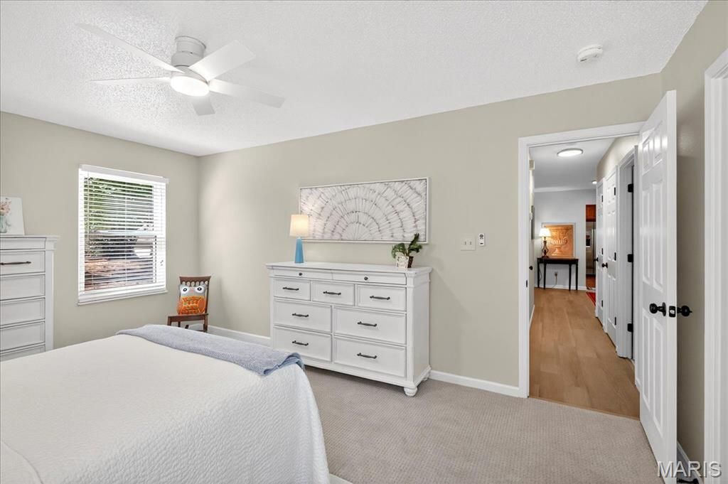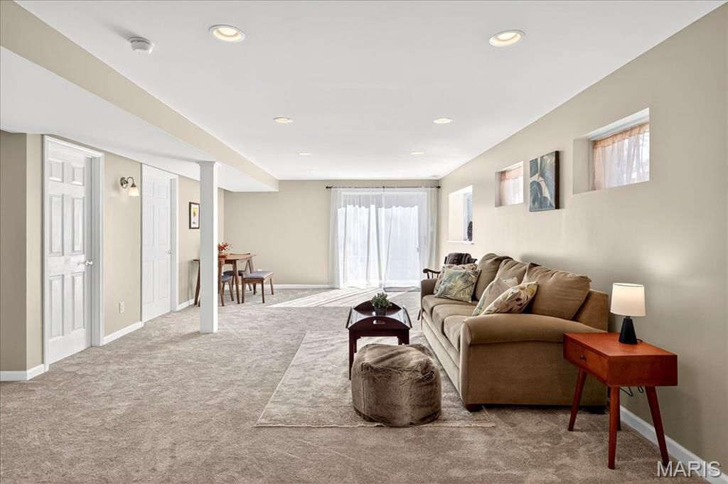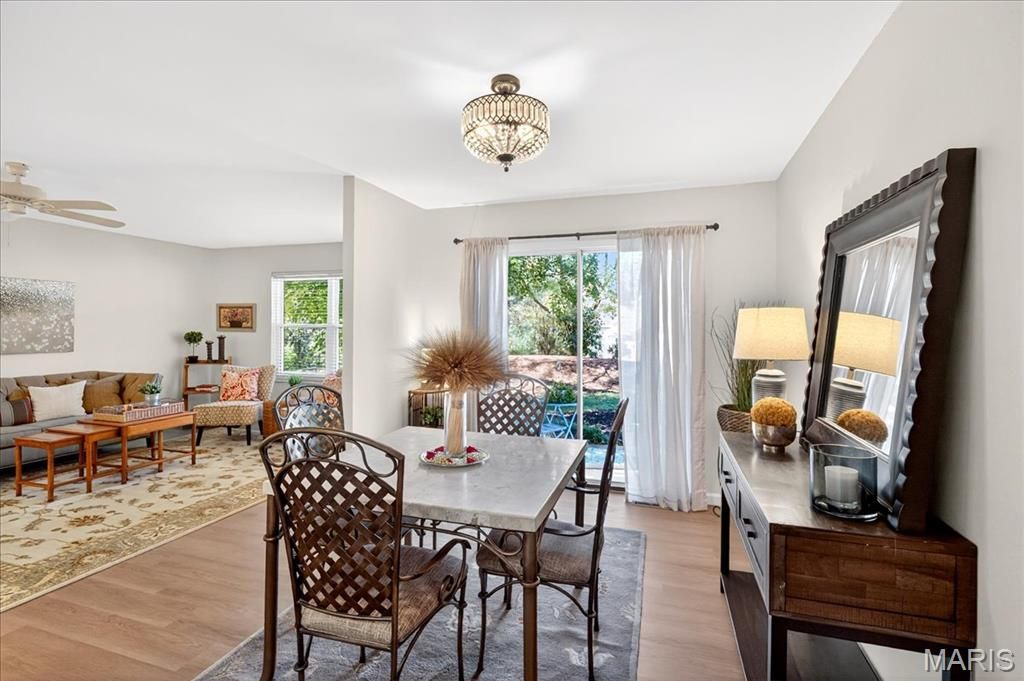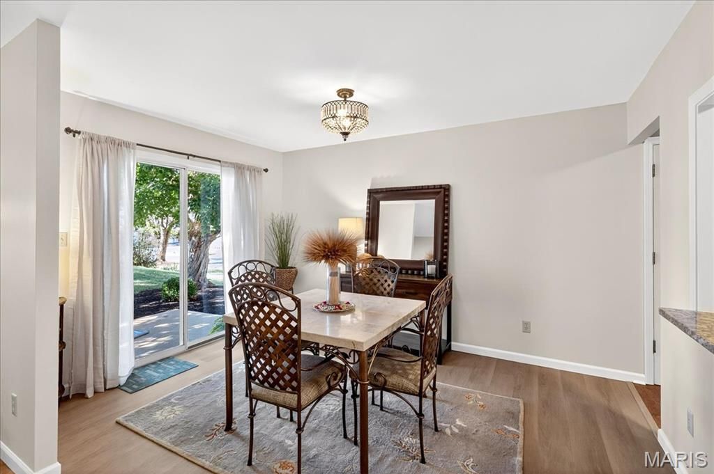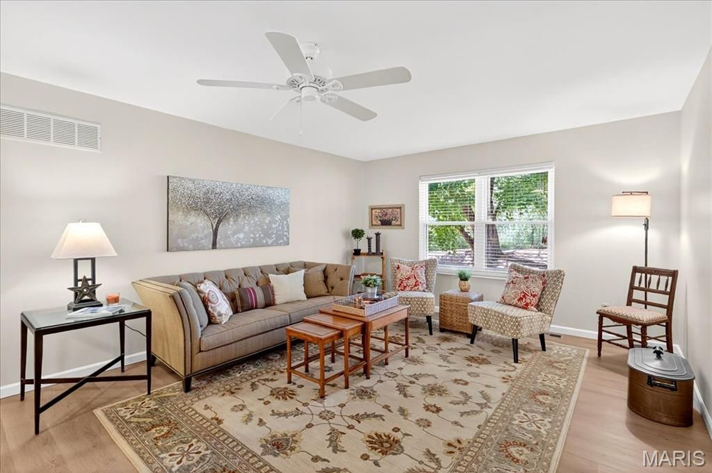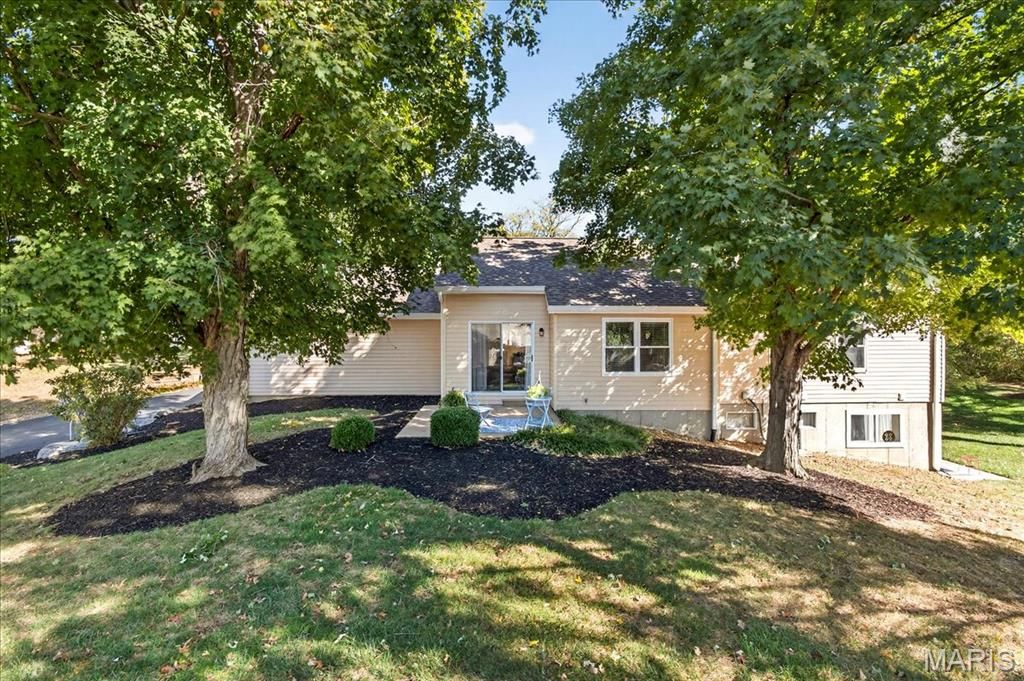 Excellence abounds in this tastefully-updated turnkey villa that offers main-level living and a carefree lifestyle and is an end unit. The attached two-car garage gives easy access to the updated kitchen featuring 42-inch wood cabinets, granite counter tops, stainless steel appliances, new lighting and a granite breakfast bar which looks into the dining room. Dining room walks out to a lovely patio and is open to the living room and entry foyer with a coat closet. All with new lighting, LVP flooring, and freshly painted. Main level has two updated bathrooms and two bedrooms which have new fans, new upgraded designer carpet, are freshly painted, and both have great views of nature. The primary bedroom has a huge walk-in closet and en suite bathroom. Walkout lower level is fully finished with new carpeting. This area has another private patio that is a nature enthusiast's dream - backing to STL County parks complete with nature walking trails. Lower level has an updated laundry room, half bath, huge walk in cedar closet, and two additional storage rooms. We believe this is the most desirable and private lot in Hickory Sound - yet is a stone's throw away from the clubhouse, pool, and tennis/pickleball courts.