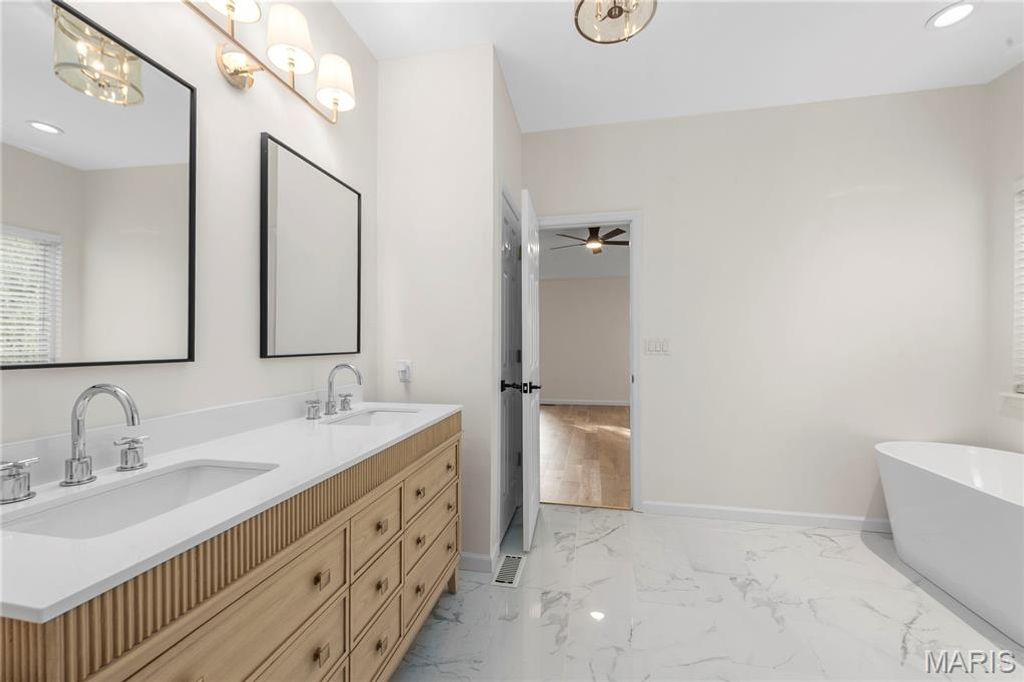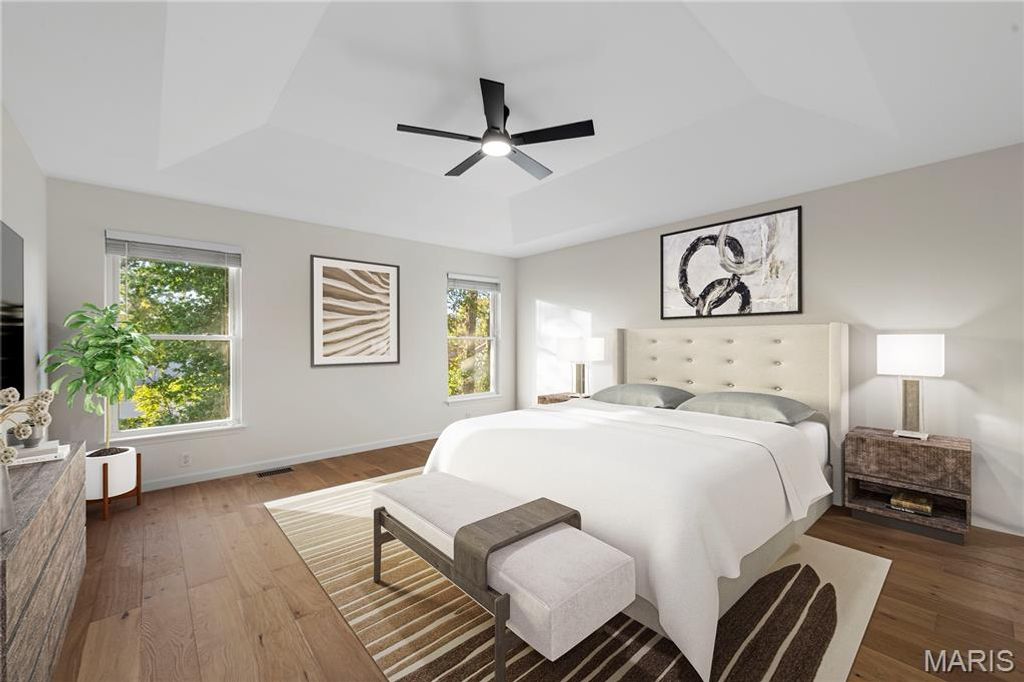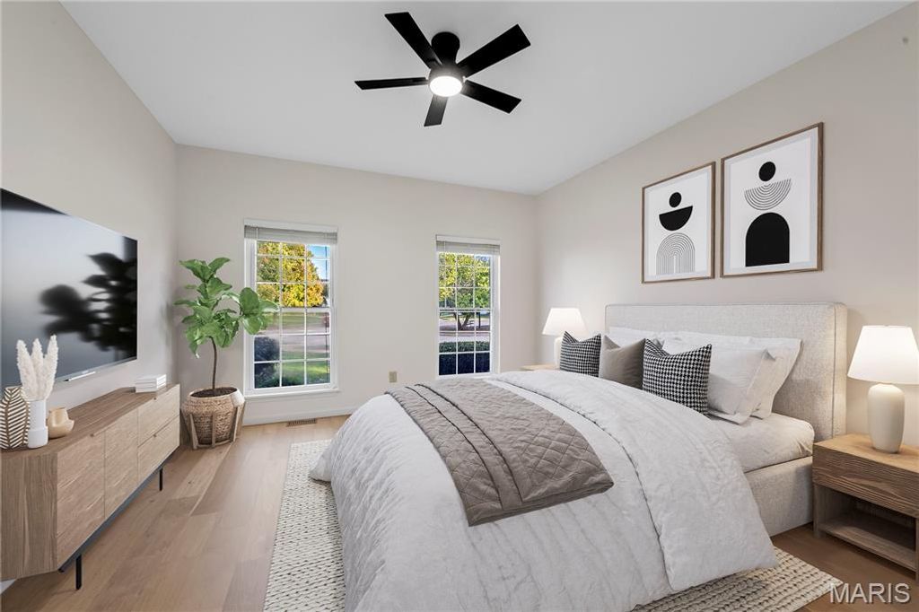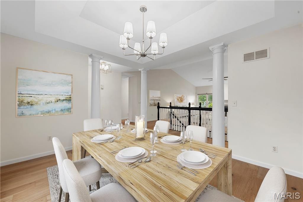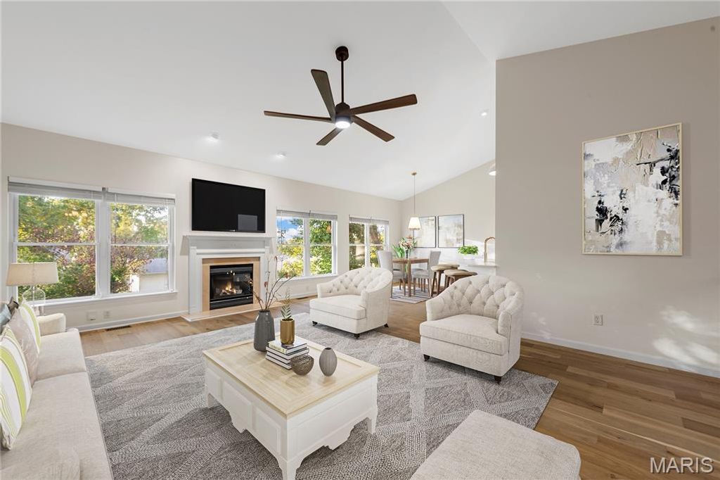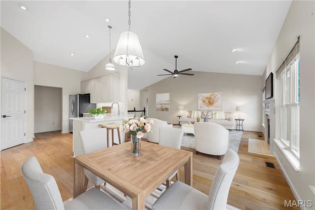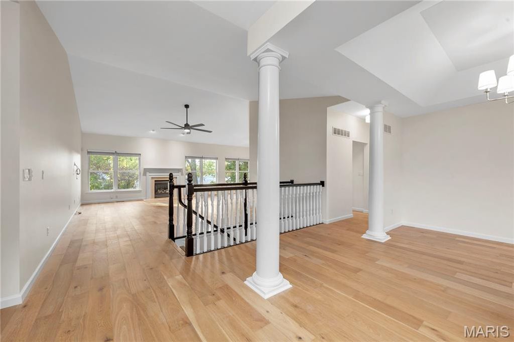 NEWLY RENOVATED, never been used former display home with fresh, designer renovations completed by the current owner. This sophisticated 4-bedroom, 3.5-bath residence blends modern style with timeless architectural detail, beginning with a striking brick and stone exterior and an oversized three-car garage. Inside, the home showcases new wide-plank, light hardwood flooring that extends throughout the entire main level and into all bedrooms, allowing the eye to travel seamlessly from room to room for a cohesive, elevated aesthetic. The great room features a vaulted ceiling and a gas fireplace, creating an inviting focal point for everyday living and entertaining. The kitchen has been completely reimagined with quartz countertops, cabinetry, new stainless steel appliances, and modern fixtures and lighting. Adjacent to the kitchen, a bright breakfast area opens to the main living space, while a coffered formal dining room framed by architectural pillars adds sophistication and drama. The primary suite is a true retreat, highlighted by a coffered ceiling, a NEW stunning spa-inspired bath with new shower, beautiful free standing tub, and an expansive walk-in closet. Secondary bedrooms are generously proportioned and continue the seamless flooring transition. The hall and half baths are also newly refreshed. Located on a quiet cul-de-sac within the distinguished Rockwood School District, known for strong academic programs, extensive student opportunities, and consistent district-wide excellence. Every renovation is fresh, thoughtfully selected, and designed to deliver both refined style and effortless living. Truly move-in ready and exceptionally executed for a timeless and warm forever home.