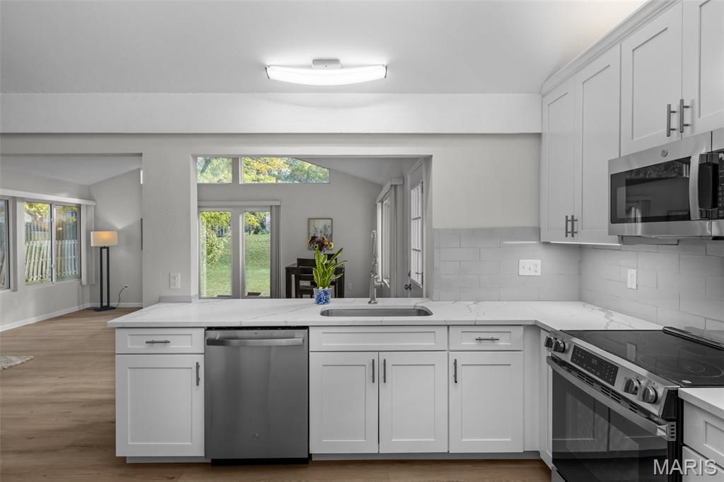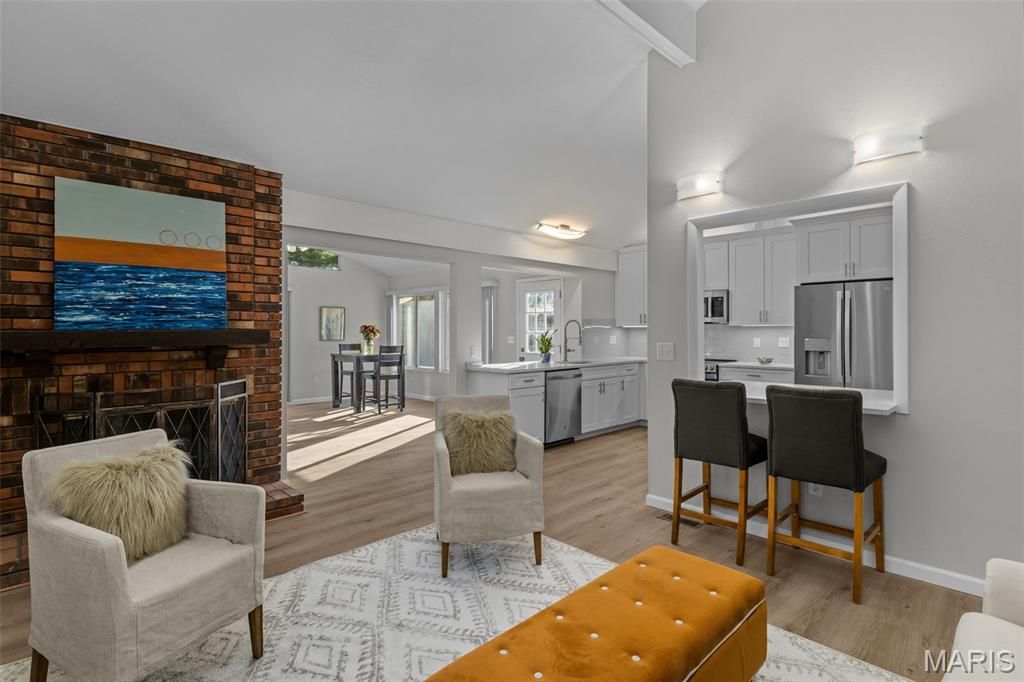 Beautifully updated turn-key ranch home in Parkway West Schools! Complete main floor living. Bright and open floorplan featuring stunning vaulted ceilings throughout the main living spaces. Completed updated gourmet kitchen with 42" custom cabinetry, quartz countertops, stainless steel appliances, under cabinet lighting, an island and a breakfast bar (kitchen new 2025). The kitchen is open to the family room with a cozy woodburning fireplace, and the spacious great room/sunroom which is the ideal bonus space for anything your family may need. This home allows in an abundance of natural light! Large formal living room and dining room in the front of the home. The primary suite has a private completely updated full bathroom (2025) and walk-in closet with a main floor laundry hookup for a stackable W&D, a huge added bonus! 2 additional bedrooms and an updated full hall bathroom (2025) complete the main level. The basement is the perfect blank slate with rough-in plumbing for a full bathroom and an additional laundry hookup (basement washer and dryer included with the home). Large level backyard with a patio perfect for entertaining! Award winning Parkway West Schools. Fantastic location just minutes from shopping and restaurants. New Roof (2025). Some new windows (2025). Fresh landscaping (2025). New updated LVP flooring throughout the home (2025). You do not want to miss this opportunity, Welcome Home!