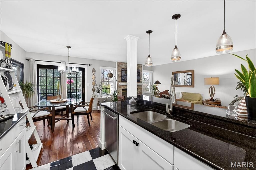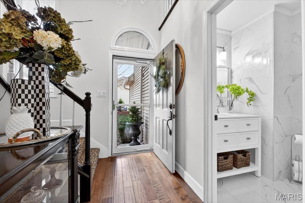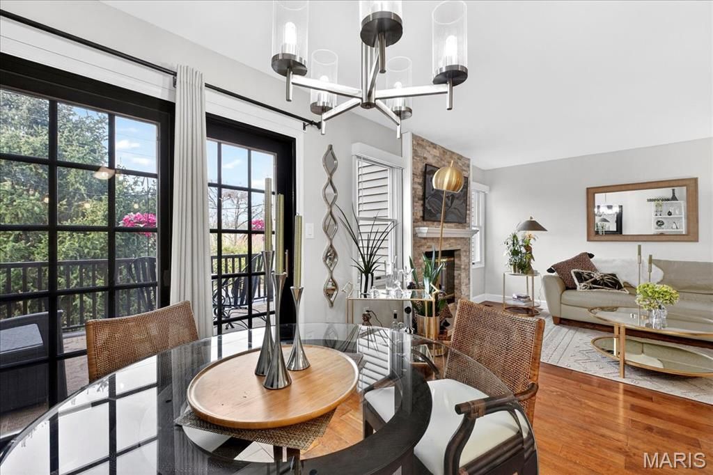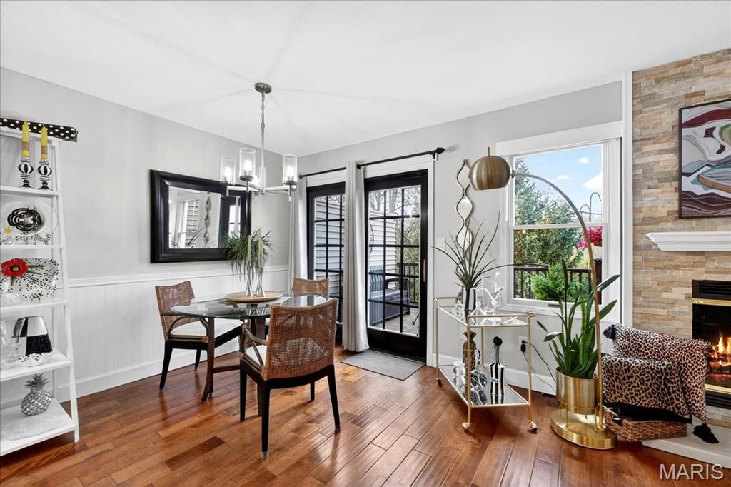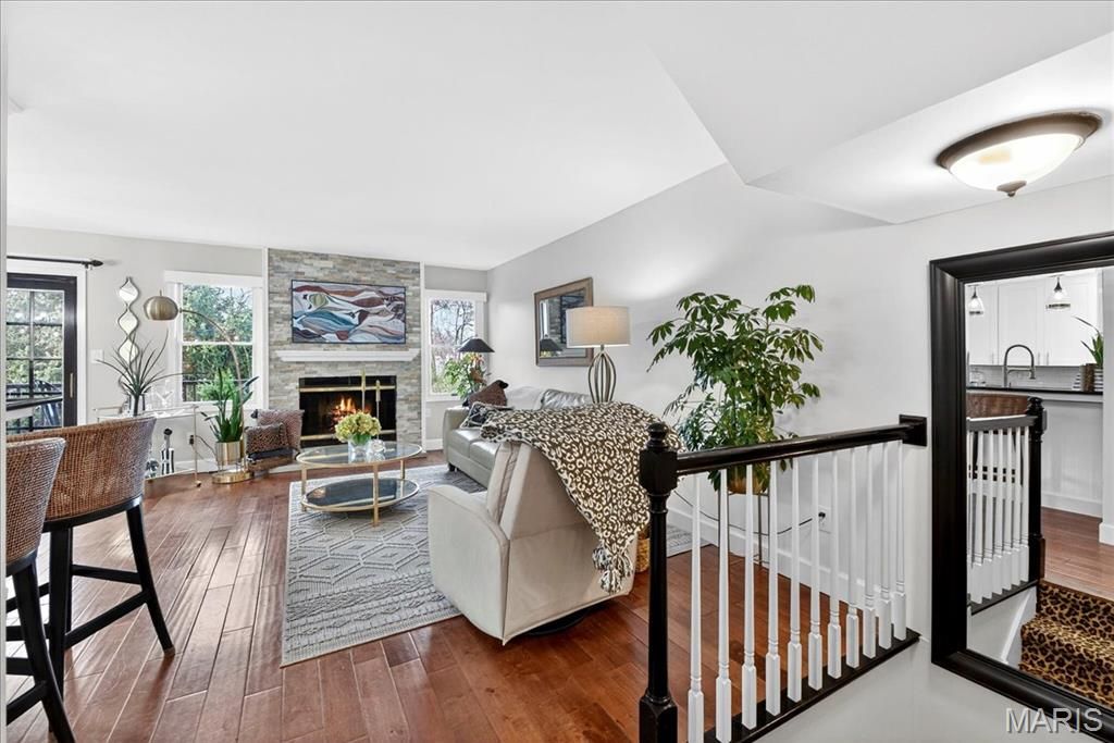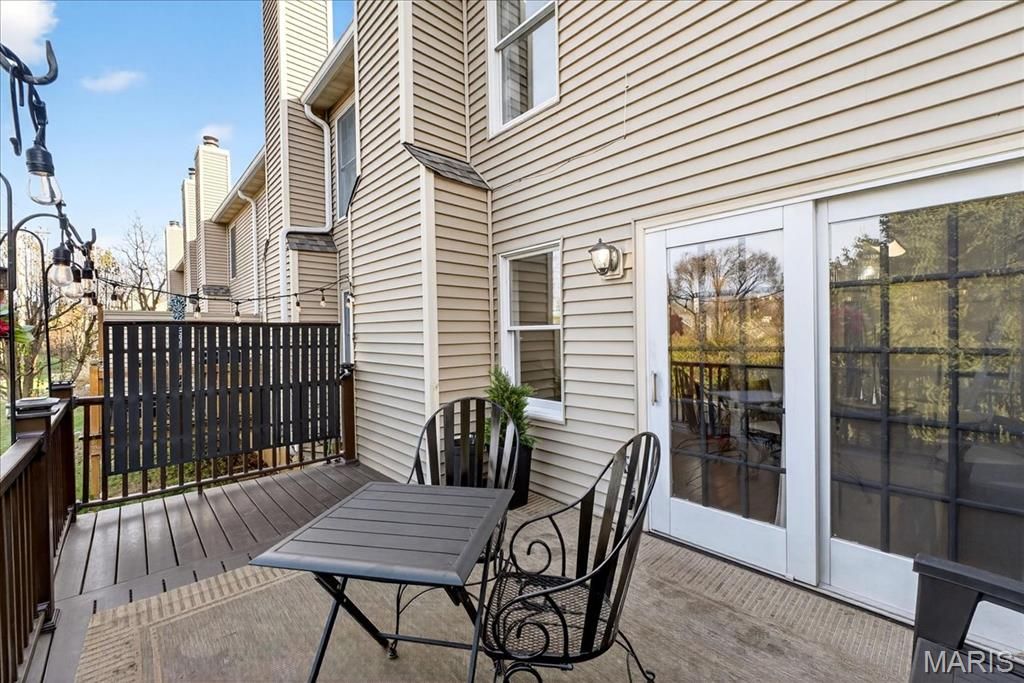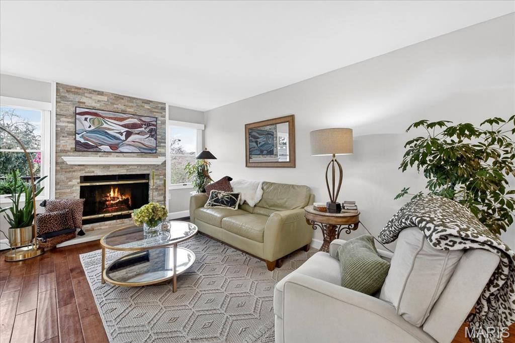 Experience comfort and style in this beautifully updated townhome with a dramatic two-story entry, white 42 in. shaker kitchen cabinets, many with pull out drawers, granite countertops, stainless steel appliances, and hardwood floors throughout most of the main living areas. The living room features a stack stone gas fireplace, while the main floor also includes a convenient updated half bath and access to a newly replaced, low-maintenance deck overlooking private wooded views. Upstairs, the oversized primary suite impresses with vaulted ceilings, double closets with custom inserts, and a luxurious updated ensuite featuring a large walk-in shower and generous vanity area. A second bedroom and full bathroom complete the upper level. The finished lower-level rec room offers flexible space for entertaining or relaxation. Perfectly located just minutes from shopping, dining, parks, and the Chesterfield Amphitheater, this home also offers incredible community amenities, including a sparkling pool, landscaping, new roof and snow maintenance, and meticulously maintained common grounds. Move in and enjoy low-maintenance, effortless living in one of Chesterfield's most sought-after communities!
