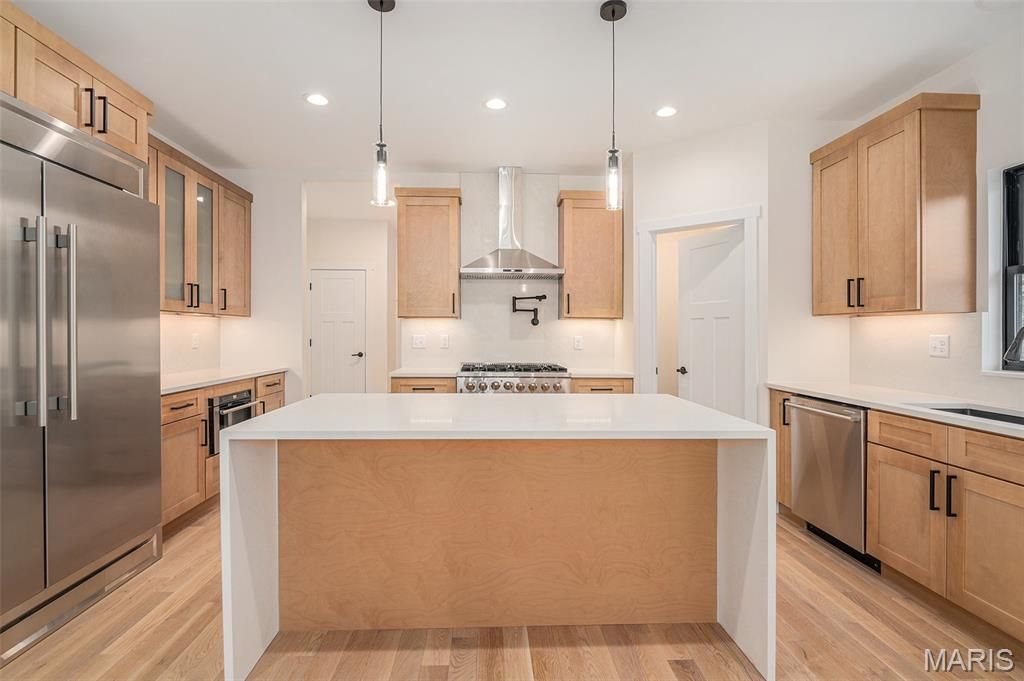Inside, you'll find 9-foot ceilings and 3/4-inch solid hardwood flooring throughout the main level. The chef's kitchen includes a striking waterfall island, all appliances are Forno including a custom built-in 60-inch refrigerator, 36-inch wide range and hood, dishwasher, pot filler, large walk-in pantry, custom cabinetry, and under-cabinet lighting for added ambiance and function.
