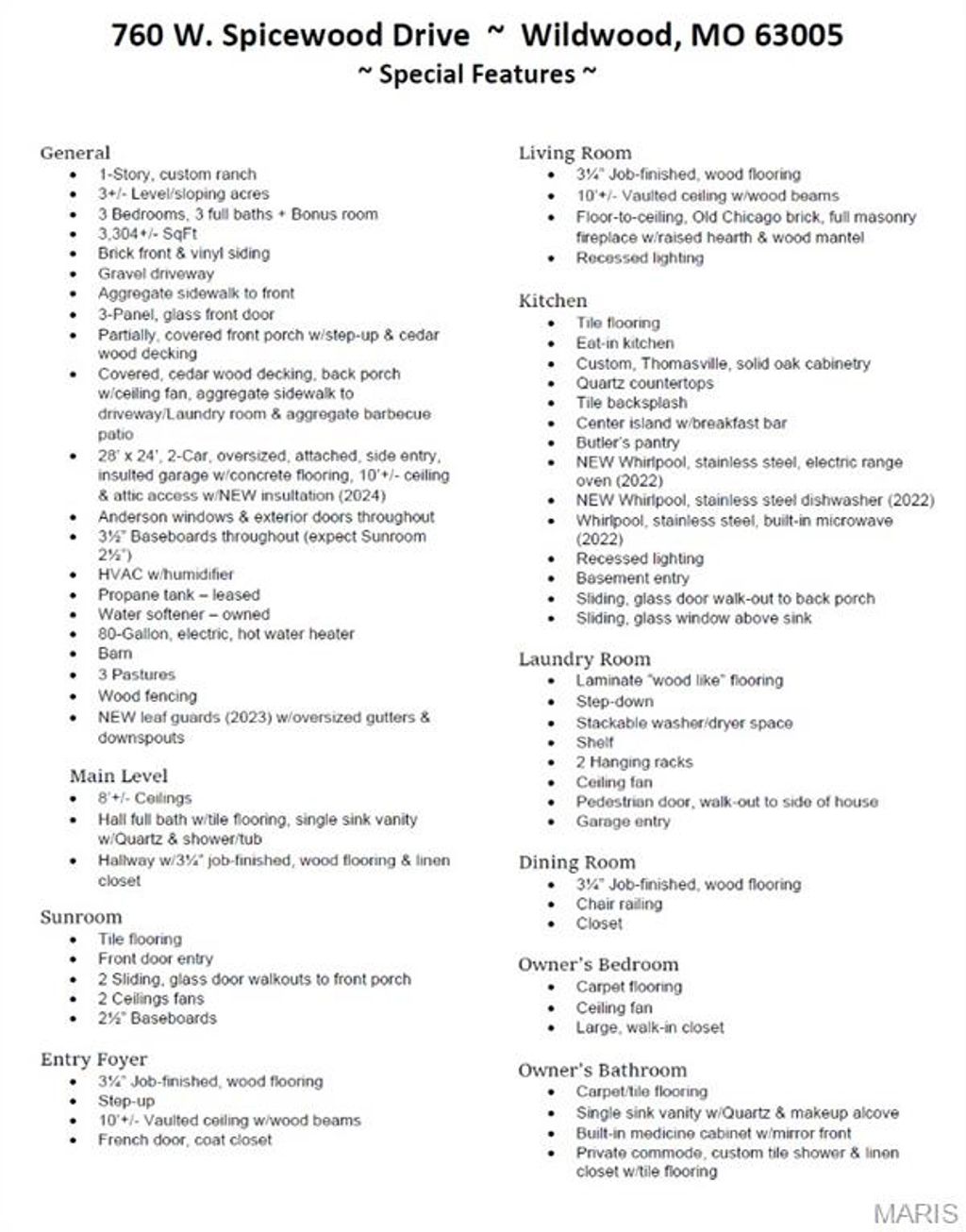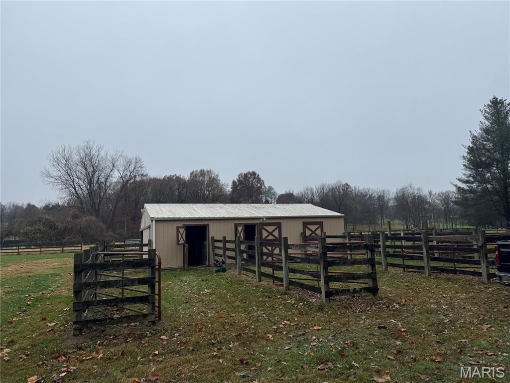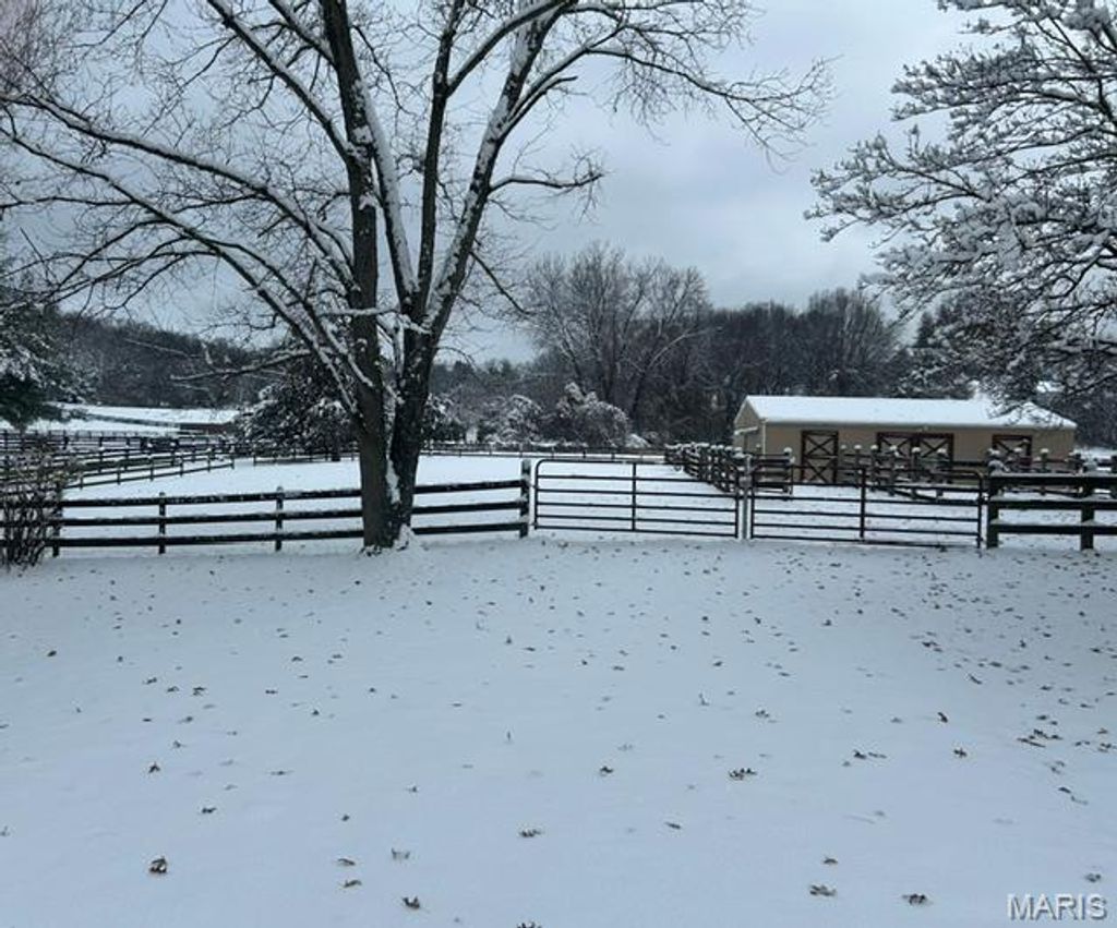 This fully outfitted equestrian/homesteader property, RIGHT OFF WILD HORSE CREEK ROAD, features 3+/- level acres with 3,304+/- SqFt ranch home, oversized 2-car attached garage, 37'x25' 3+stall aluminum barn w/turnouts & 3 pastures w/wood fencing. Charming 3 bedroom & 3 full bath home with bonus room. Partially covered wood front porch greets you as you step inside the Sunroom w/tile flooring, 2 sliding glass door walkouts & 2 ceiling fans. Step-up entry foyer to living room boasts job-finished wood flooring, 10'+/- vaulted ceiling w/wood beams, French door coat closet, floor-to-ceiling Old Chicago brick full masonry fireplace & recessed lighting. Eat-in kitchen features custom cabinetry, NEW Whirlpool stainless steel appliances, Quartz counters, tile backsplash, center island w/breakfast bar, butler's pantry & sliding glass walk-out to back covered wood deck. Owner's suite w/carpeting, large walk-in closet & a bath boasting single sink vanity w/Quartz & makeup alcove, private commode w/custom tile shower & linen closet. 2 Additional bedrooms w/carpet flooring & slide closets share hall full bath. Dining room & laundry room completes the main level. Expansive, lower level extends living quarters that features a large rec room w/wet bar, pool table, air hockey table & recessed lighting. Bonus room w/walk-in closet, built-in desk & ensuite full bath w/rec room access. Un-finished storage room completes the lower level. Access to 2,500+/- acres of Babler Park right across the road for miles of hiking, biking & horse riding trails. Within the Rockwood School District w/easy access to Hwy 109/Wild Horse Creek Rd, shopping, dining, & Chesterfield Valley amenities. MUST SEE! Photos to come! 🙂