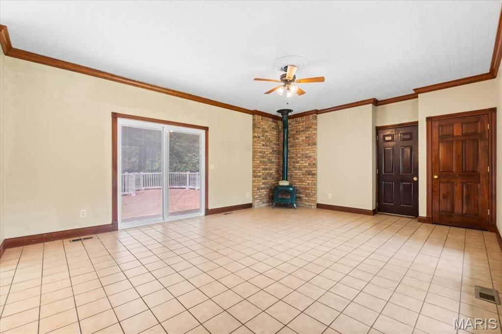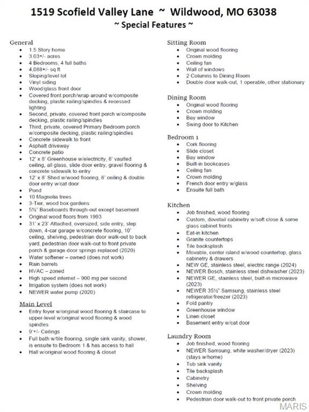 Welcome to 1519 Scofield Valley Lane, located in the highly desirable Wildwood area! A level driveway leads to a charming 1.5 story home resting gracefully on 3+/- acres providing a peaceful and tranquil atmosphere. The home boasts 4 Bedrooms, 5 full baths, with 4,088+/- sq ft of living space. A wrap around deck allowing expansive scenic views of the acreage & greets you as you step inside the entry foyer. Sitting/dining room features original wood flooring, columns, bay window, walkout to deck & swing door to Kitchen. Eat-in kitchen flaunts custom cabinets, granite counters, job finished wood floors, movable center island & NEWER stainless steel appliances. Main level bedroom, features a bay window, built-in bookcases, French door entry and ensuite full bath. Completing the main level living space is a sunroom, laundry room & hearth room w/wood burning freestanding stove. Upper level primary suite w/job finished wood floors, bay window, private deck, separate walk-in closets and double sink vanity, shower & jet tub. 2 Additional bedrooms w/job finished wood floors, slide closets & share a hall full bath. Walk-out lower level boasts a large rec room with a wet bar, full bath & bonus room. Outside, you will enjoy a shed & greenhouse w/electricity. Within the Rockwood School District w/easy access to Hwy 100/Manchester Rd, shopping, dining, & Wildwood amenities. Must see!