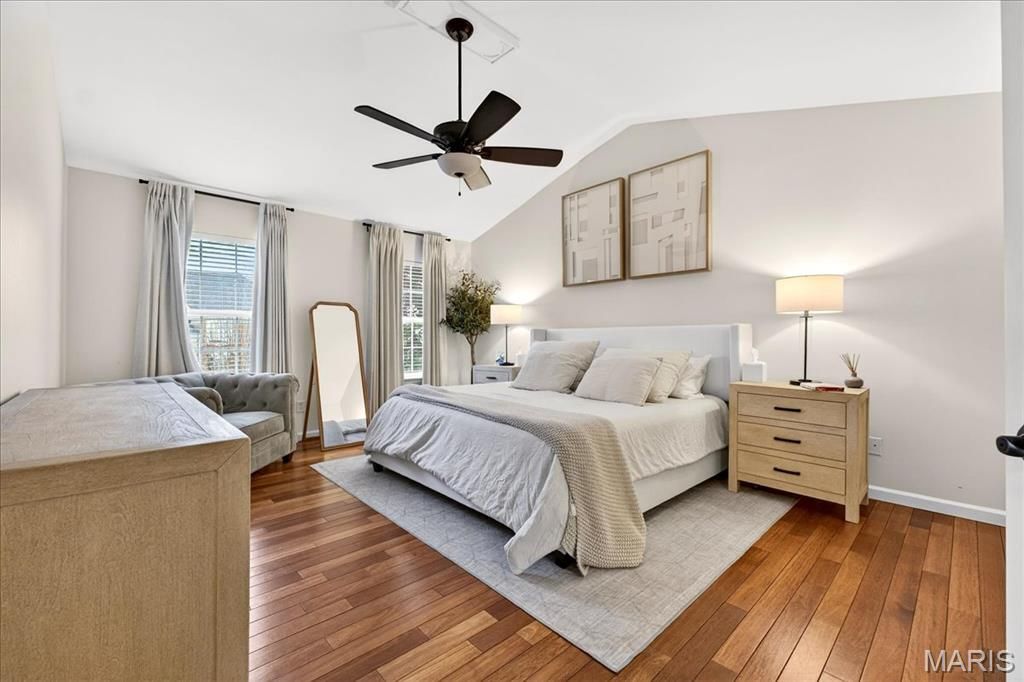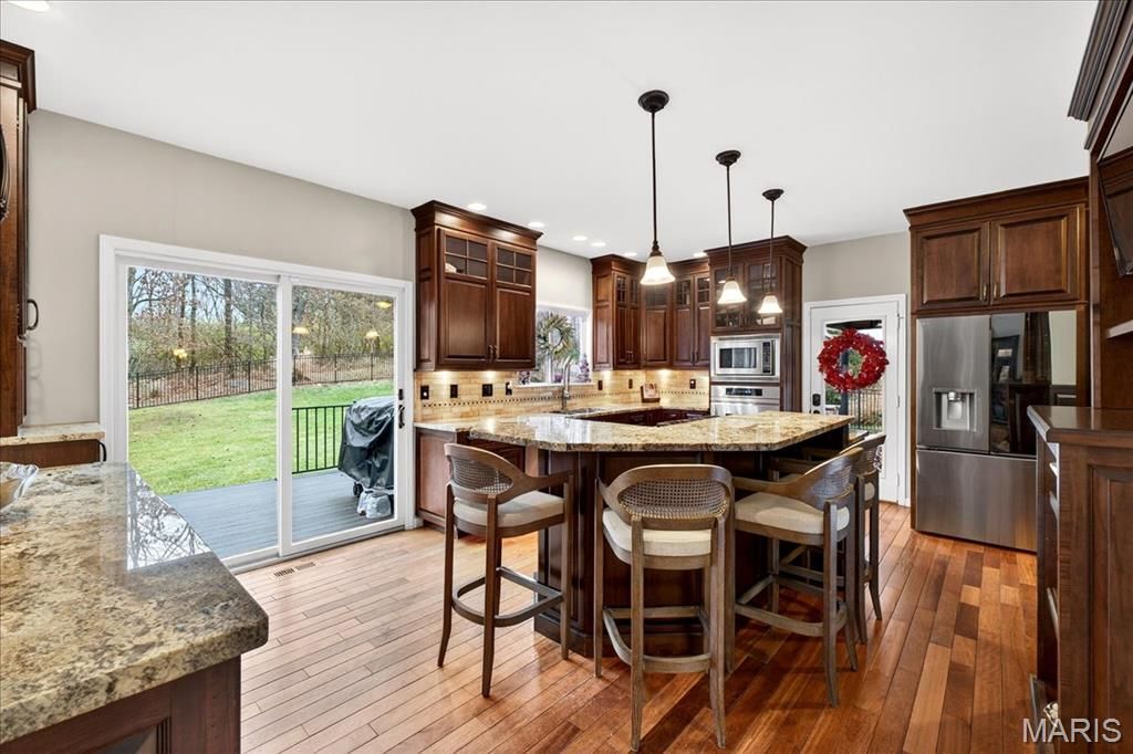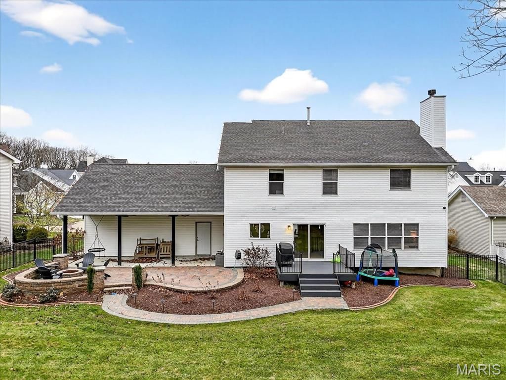 Tucked at the end of a quiet cul-de-sac and backed by mature woods, this Crown Pointe gem blends luxury, privacy, and thoughtful design. The gourmet kitchen stands out with its center island, custom cabinetry, granite surfaces, and premium appliances. A stylish serving bar with a wine rack, glass-door cabinetry, and a built-in wine cooler makes entertaining effortless in this open concept design. The main level offers a formal dining room, living room, family room with a wood-burning fireplace, laundry room, and powder room"”all set atop rich hardwood floors. Upstairs, the primary suite impresses with vaulted ceilings and a beautifully remodeled spa-like bath featuring a standalone soaking tub, floor-to-ceiling tiled shower, double granite vanity, and a generous walk-in closet. Three additional bedrooms"”each with its own walk-in closet"”plus an updated second full bath round out the upper level. The finished lower level adds even more versatility, showcasing a granite-topped walk-behind bar, full bath, dedicated exercise space, and a cozy rec room highlighted by a stone accent wall and built-in electric fireplace. Outside you'll find a newly resurfaced deck with composite material, a covered porch, and an expansive paver patio complete with a firepit. The well sized backyard is fully fenced and backs to woods for added comfort and the utmost privacy. This yard would be perfect for a pool! All of this within walking distance to Ridge Meadows Elementary, a part of the award winning Rockwood School District. Come see for yourself! Showings will open up at the Open House Saturday 1/3 from 12-2pm.