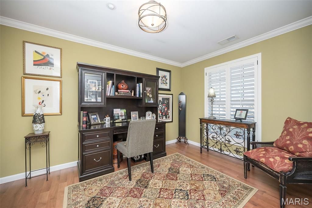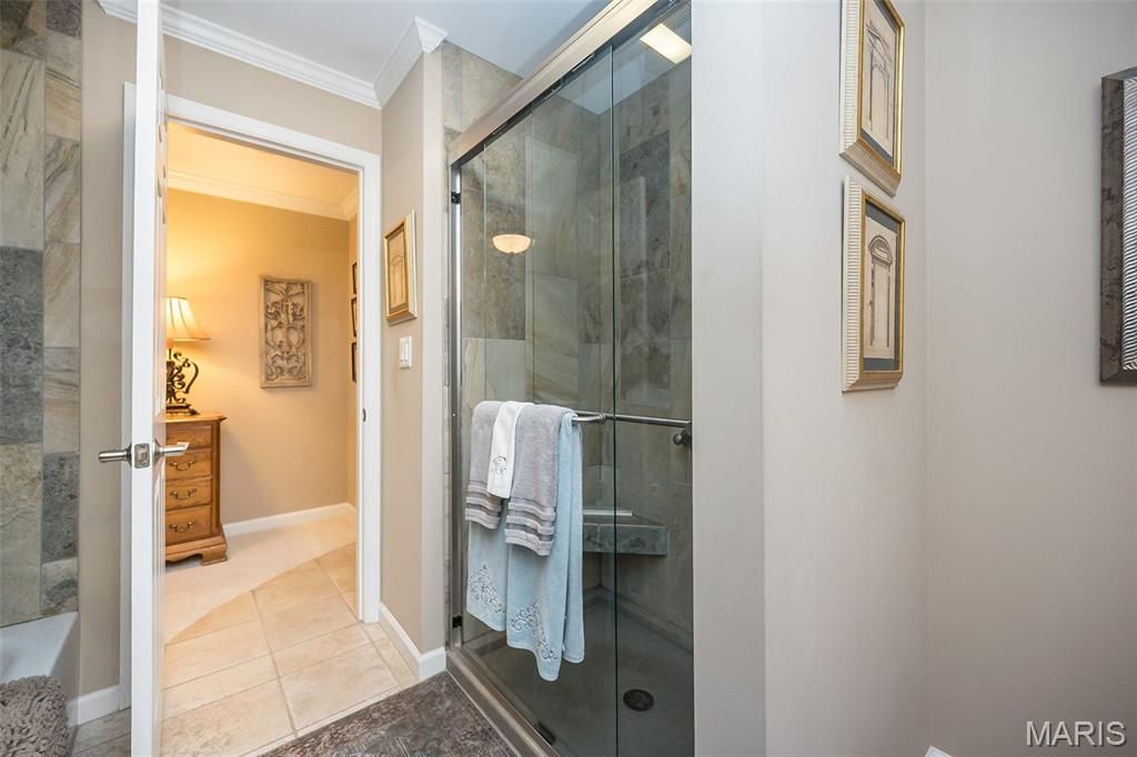 Exquisitely remodeled and thoughtfully designed, this spacious condo showcases upscale finishes and exceptional attention to detail throughout. Enter through beautiful wooden double doors into a slate foyer accented by crown molding, setting the tone for the refined interiors beyond. From the foyer, the home flows to the right into a stunning open-concept main living area, and to the left toward a private primary suite wing"”offering an ideal balance of entertaining and retreat. The open-concept living space features a custom kitchen with contrasting wood cabinetry, double convection ovens, a 5-burner glass cooktop, and an expansive island"”perfect for gatherings. Thoughtful upgrades include USB-equipped outlets and distinctive, upscale hardware. The adjoining great room is anchored by a full masonry gas fireplace and opens to a composite deck with peaceful pond views. A well-appointed dining area completes this inviting space. Also on this side of the condo are a den, a laundry room with ample built-in storage, and two bedrooms, each featuring upgraded finishes and enhanced lighting fixtures, a jack and jill bath with separate tub and shower, tiled to the ceilings with convenient insets. The private primary suite wing offers exceptional versatility and comfort, including a game room, secondary living room with a wet bar, and a dedicated home office. The wet bar features glass shelving, a composite sink, and granite countertops. The living room provides access to an additional composite deck and features a fireplace with a marble surround, with French doors leading to the primary suite and office on opposite sides. The spacious primary suite is a true retreat, highlighted by a chandelier, plantation shutters, an 11' deep walk-in closet with a custom Closet Company organizer, and a beautifully remodeled primary bath featuring a vessel bowl sink, adult height vanity and upscale finishes. Throughout the home, crown molding extends into the remodeled bathrooms, while all insulated windows are fitted with elegant plantation shutters. Recessed lighting throughout, rocker panels with dimmers for every lighting need. Dual HVAC systems and water heaters are new in 2025, as is the refrigerator. The building roof is new in December of 2025. There are 2 reserved parking spaces in the underground garage with easy elevator access. This renovated building has no curbs at the front parking area, and no steps to the elevator for exceptionally easy access. There is a beautiful lobby where residents gather, and the 3rd floor has a community reading room (or wine room, depending on your preference!) as well as a room for gatherings and parties. You can enjoy the pool in the summer and stroll the beautiful grounds around the community pond. Your pet is welcome in the Brandywine Community! Owners are allowed to have one dog that is under 45 pounds or one cat. And it's right around the corner from the dog park, Barnes and Noble, Dierbergs, Starbucks and more!! A rare opportunity to own a completely remodeled condo offering refined craftsmanship, custom details, and tranquil views"”all designed for both comfort and style.
