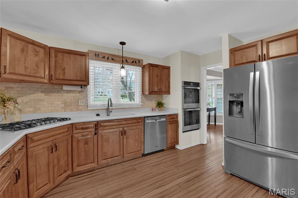 Your opportunity to have a gorgeous & updated 5 bedroom 3 bath ranch home in sought after Lafayette Farms Subdivision for the New Year! Approximately 3220 sq feet of living space! Get ready to be WOWED when you enter to a very open vaulted floor plan with an abundance of natural light. Newer bamboo flooring on majority of the main floor. Dining room has bay window and opens to vaulted family room & hearth room with floor to ceiling peek through w/burning fireplace. A wall of floor to ceiling windows overlooks an oversized composite deck-perfect for relaxing, grilling and entertaining. The spacious kitchen has newer stainless appliances including double ovens ('24) , dishwasher ('21) and refrigerator ('20), Plenty of custom cabinets and countertop space w/built in table area, newer backsplash & pantry. Main floor laundry room-washer/dryer stay. The vaulted huge primary suite has walk in closet and primary bath with oversized shower, custom built ins and skylight. 3 more spacious bedrooms and hall bath complete the main floor. The fabulous walk out LL has been remodeled in 2018 w/a generous recreation room, 5th bedroom, 3rd full bath and plenty of storage. Walk out to your covered patio and enjoy your fantastic level yard with mature trees. 3 car garage-RARE Find! Water heater 2020. Irrigation system. Siding, gutters & facia 2019. Front door & surround '19. Pella Windows installed throughout home 2018. This family is getting relocated - so it is time for a new owner-Could be you! Passed STL Co inspection. Parkway West Schools. Walk to Queeny Park - Location!! Both refrigerators, washer & dryer stay!