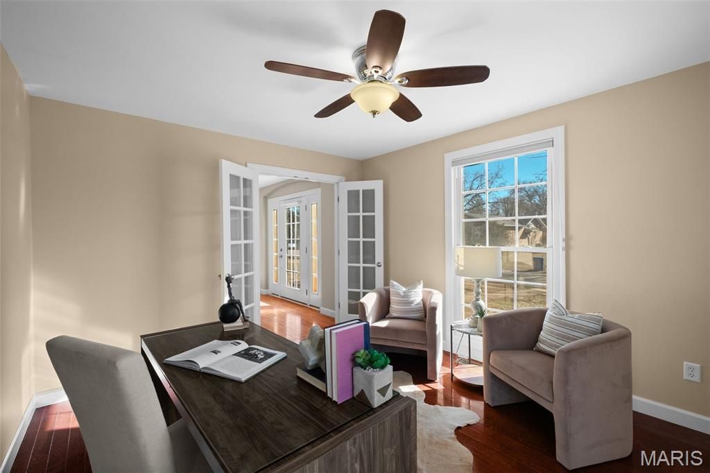 Welcome home to this charming 2-story home ideally located near Town & Country Crossing, offering convenient access to shopping, dining, walking trails, and award-winning Parkway West Schools. From the moment you arrive, you'll appreciate the inviting covered front porch and the home's fantastic curb appeal. Inside, hardwood floors flow throughout the main living areas, complemented by beautiful archway details, newer baseboards, and classic 6-panel interior doors. The main level features a spacious home office, an open staircase, and a cozy wood-burning fireplace"”perfect for everyday living and entertaining. The kitchen is thoughtfully designed with 42" cabinetry, stainless steel appliances, a built-in wall oven and microwave, and plenty of storage. Upstairs, the primary bedroom suite offers a private en-suite bath and a walk-in closet, creating a comfortable retreat. Additional highlights include newer windows, ceiling fans, and main-floor laundry hookups for added convenience. Step outside to enjoy the fenced, level backyard with a covered patio"”ideal for relaxing or hosting gatherings. A rear-entry garage adds functionality while preserving the home's charming exterior. This home combines location, layout, and timeless features"”don't miss your opportunity to make it yours!