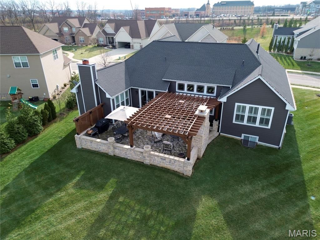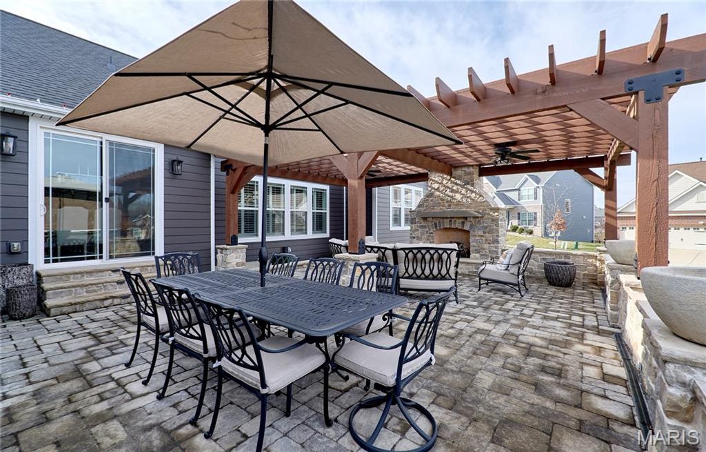 THIS HOME IS TRULY MOVE-IN READY! QUALITY FISCHER & FRICHTEL CUSTOM GREAT ROOM RANCH WITH GORGEOUS OUTDOOR LIVING, FEATURING A LARGE PAVER PATIO, STONE GAS FIREPLACE, PERGOLA WITH REMOTE FANS, EXPANDED STEPS WITH LIGHTS, AND A GENEROUS GRILLING AREA. 3-Car garage, brick facade with stone accents, J. Hardie cement siding and architectural Timberline shingled roof, irrigation system. Deluxe kitchen with upgraded cabinets flanked with crown molding, soft-close drawers, tile backsplash, large center island with overhang, stainless steel appliances, chimney hood and granite counters. Hearth room with floor-to-ceiling gas fireplace. Expanded primary bedroom with upgraded bath featuring two raised height vanities, private lavatory, soaking tub and 60x48 shower with seat. Wood flooring throughout main areas and ceramic tile in baths. Widened open stair to 9' pour lower level with wrought iron balusters. Plantation shutters throughout, updated landscaping with stone edging, remote shade at slider door and more! Convenient Wildwood location..AAA-rated schools.