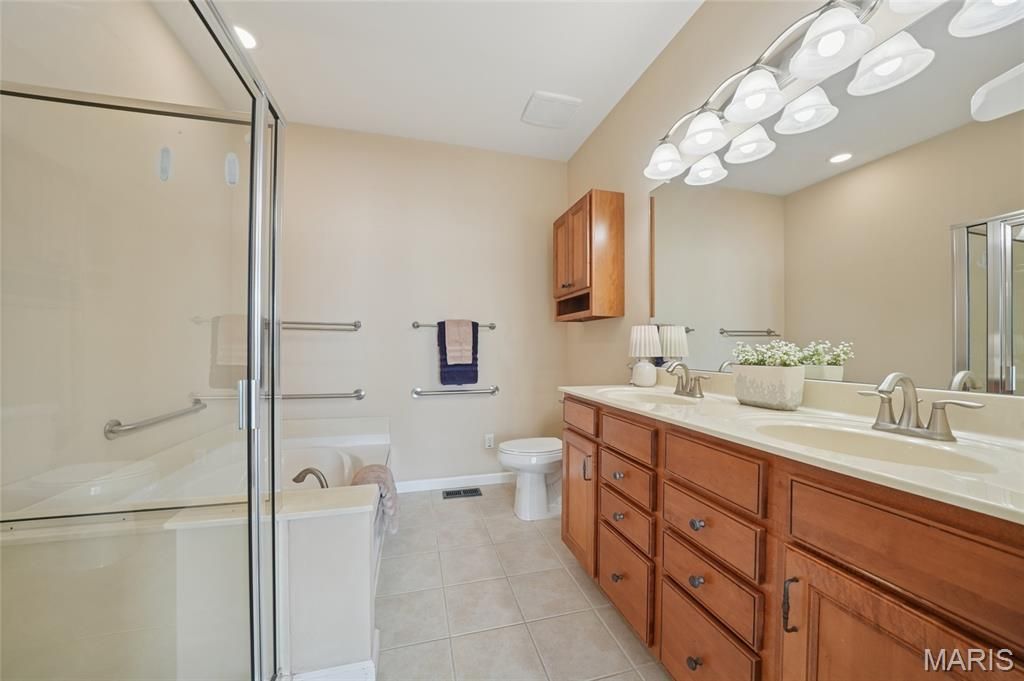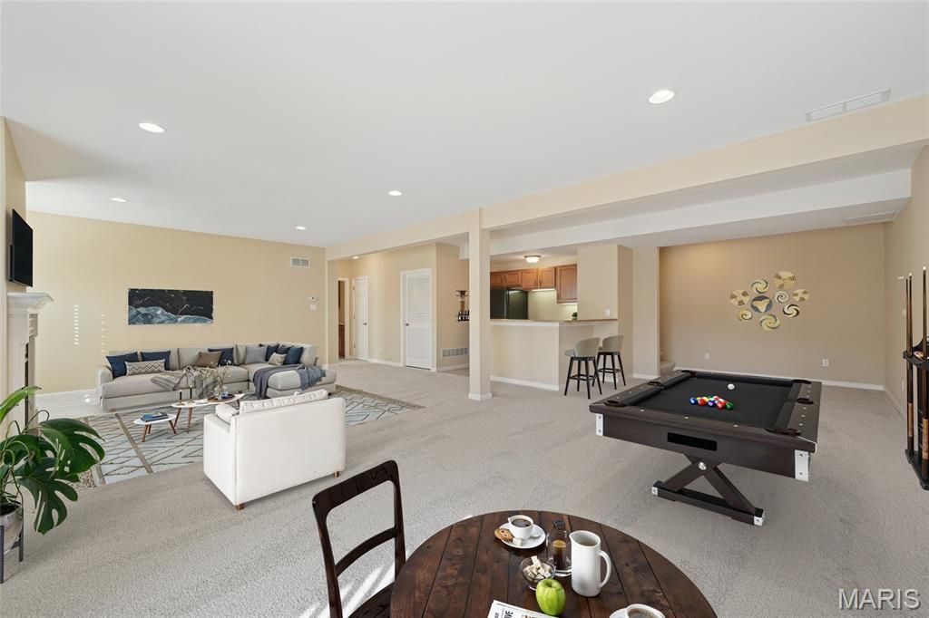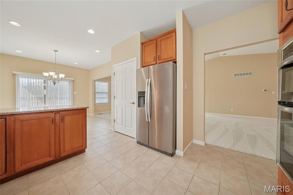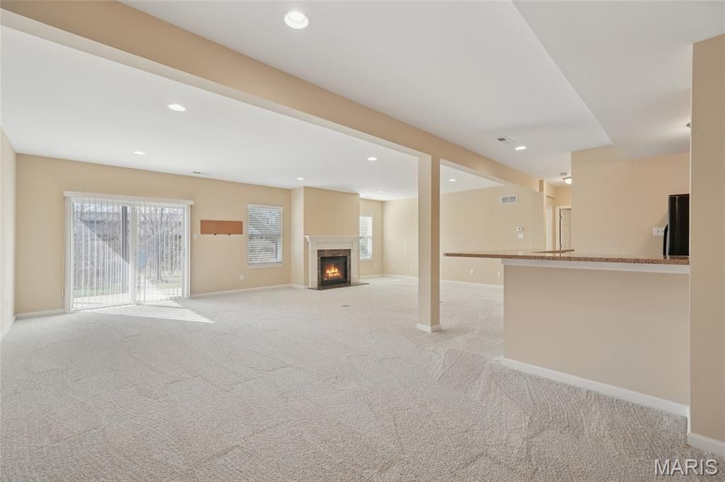 Discover this thoughtfully appointed three bedroom, three bath villa featuring a versatile layout, impressive upgrades and new carpet throughout! The expansive great room features a soaring vaulted ceiling, a gorgeous gas fireplace and abundant natural light"”perfect for relaxing or entertaining. The kitchen impresses with granite countertops, stainless steel appliances (refrigerator can stay), pantry and direct access to the screened-in deck"”ideal for outdoor dining and gatherings. The main floor primary suite is a true retreat with a bay window, custom walk-in closet and spa-inspired bath offering a jacuzzi tub, separate shower and double vanity. A second spacious bedroom located next to the second full bath is perfect for guests or a dedicated home office. Convenient main-level laundry with the included washer and dryer adds ease to everyday living. The finished lower level offers a complete second living space featuring a large bedroom, full bath, bar area, cozy living room with fireplace and walkout to a covered patio. Great end-unit at the end of a cul-de-sac. Two car garage. Backs to common ground. Don't miss this opportunity to own a villa that combines versatility, functionality and upgraded features"”all in a prime Chesterfield location!