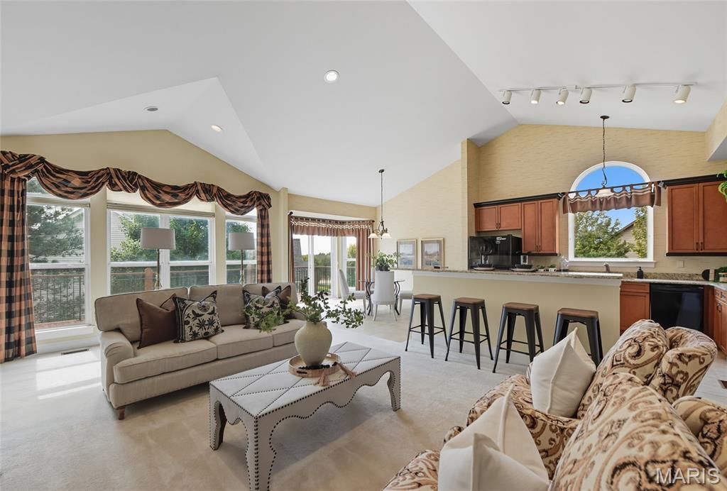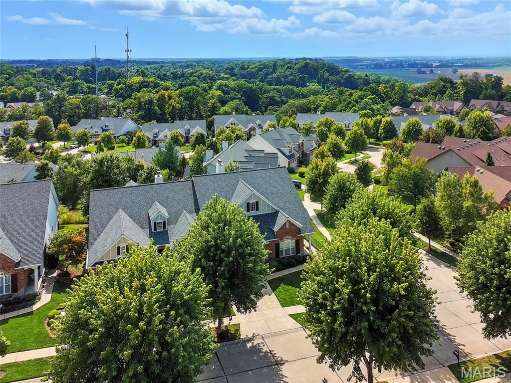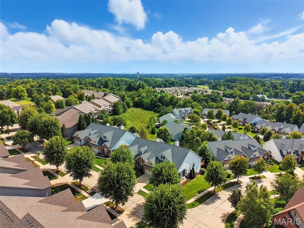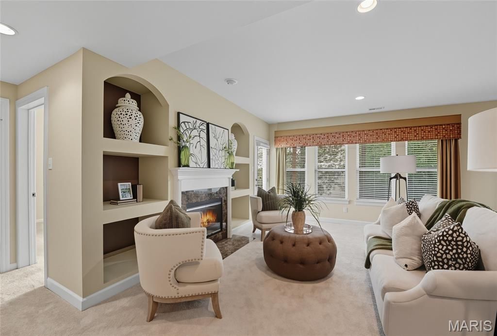Welcome to the Villages of Kendall Bluff, a gated, low-maintenance villa community designed for effortless living. This beautifully appointed Calgary model ranch villa offers 2 bedrooms and 2.5 baths and is positioned on a premium, elevated corner lot with picturesque views. Formerly a display home and meticulously maintained by its original owner, this residence features an open, light-filled floor plan with thoughtful upgrades throughout. Attractive curb appeal leads to a side-entry with an extended covered porch. Inside, ceramic tile flooring sets the tone. The main level offers a private office with French doors and custom built-ins, along with a formal dining room highlighted by an elegant tray ceiling. The vaulted great room seamlessly connects to the kitchen, creating an ideal layout for everyday living and entertaining. A stunning fireplace framed by soaring built-ins and a wall of windows anchors the space. Step out from the kitchen to a private deck - perfect for relaxing or hosting guests. The vaulted primary suite is generously sized and features a spa-like en-suite bath with double vanities, separate tub and shower, and a walk-in closet. The walkout lower level expands the living space with a second fireplace, built-in shelving, recreation room, wet bar, full bath, bedroom, and an additional sleeping area, along with ample storage and access to the patio. Additional highlights include main-floor laundry, a 2-car garage, and a prime location close to Chesterfield parks, shopping, dining, major highways, and exciting nearby developments