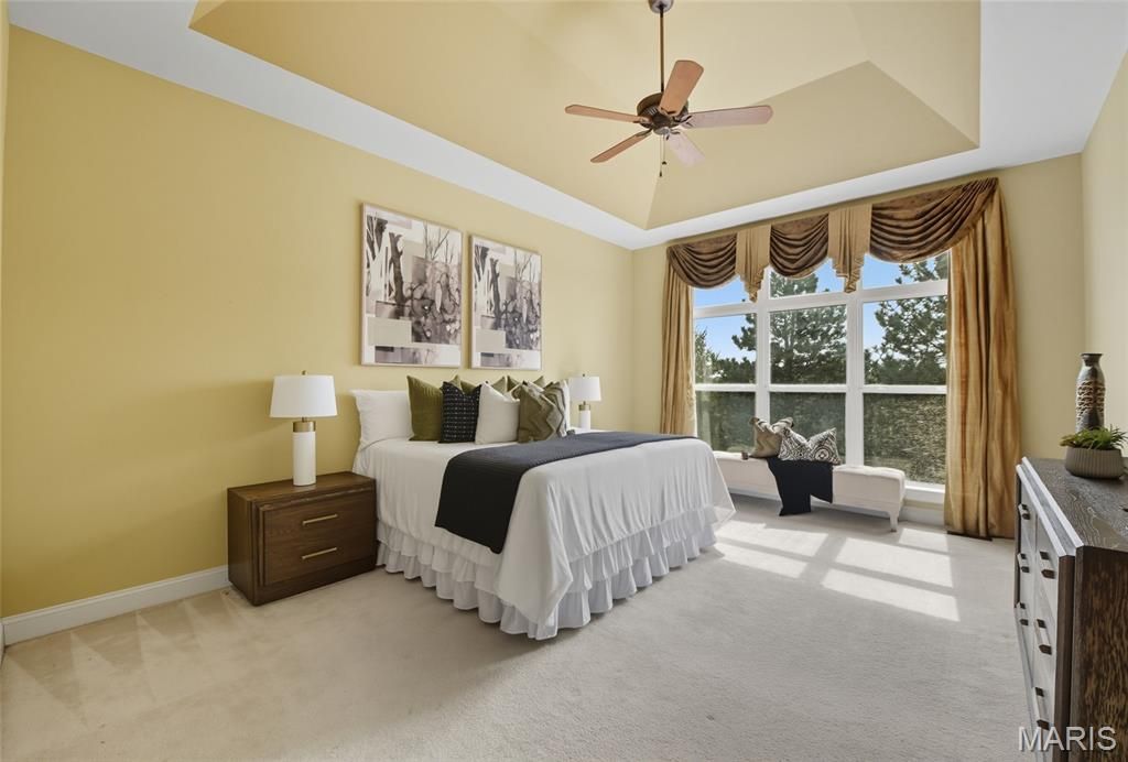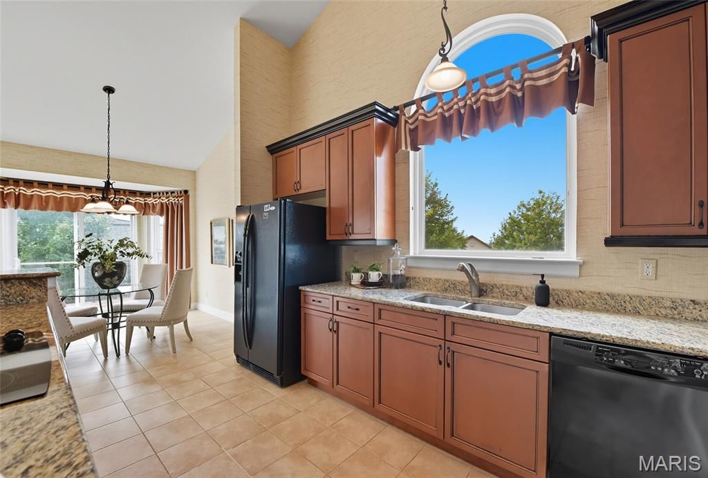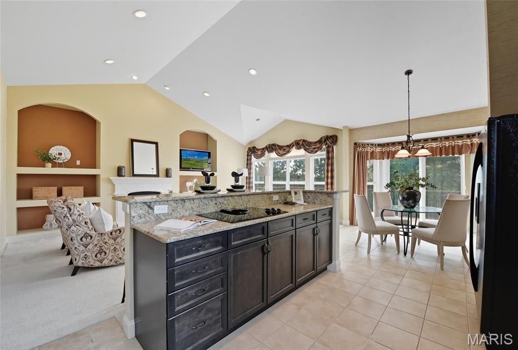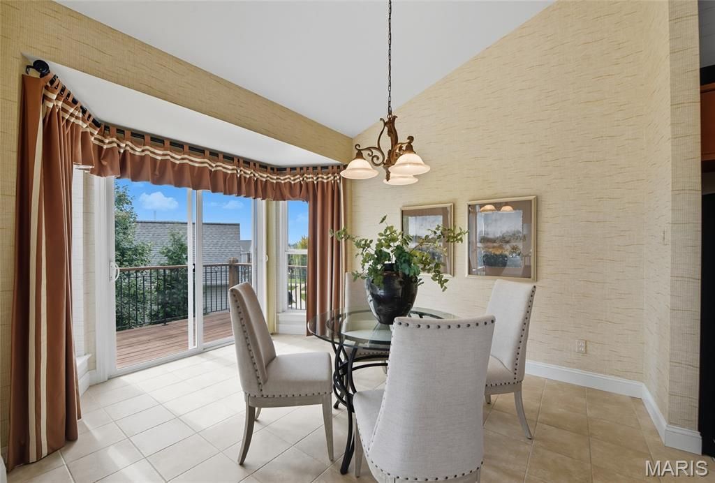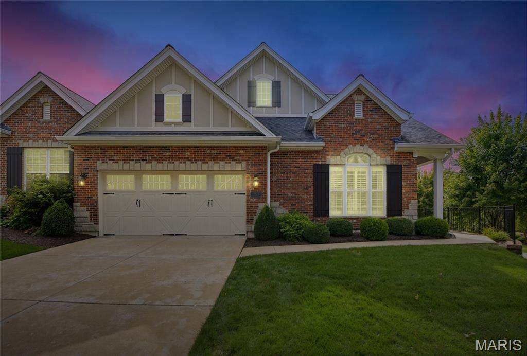 Welcome to the Villages of Kendall Bluff, a gated, low-maintenance villa community designed for effortless living. This beautifully appointed Calgary model ranch villa offers 2 bedrooms and 2.5 baths and is positioned on a premium, elevated corner lot with picturesque views. Formerly a display home and meticulously maintained by its original owner, this residence features an open, light-filled floor plan with thoughtful upgrades throughout. Attractive curb appeal leads to a side-entry with an extended covered porch. Inside, ceramic tile flooring sets the tone. The main level offers a private office with French doors and custom built-ins, along with a formal dining room highlighted by an elegant tray ceiling. The vaulted great room seamlessly connects to the kitchen, creating an ideal layout for everyday living and entertaining. A stunning fireplace framed by soaring built-ins and a wall of windows anchors the space. Step out from the kitchen to a private deck - perfect for relaxing or hosting guests. The vaulted primary suite is generously sized and features a spa-like en-suite bath with double vanities, separate tub and shower, and a walk-in closet. The walkout lower level expands the living space with a second fireplace, built-in shelving, recreation room, wet bar, full bath, bedroom, and an additional sleeping area, along with ample storage and access to the patio. Additional highlights include main-floor laundry, a 2-car garage, and a prime location close to Chesterfield parks, shopping, dining, major highways, and exciting nearby developments
