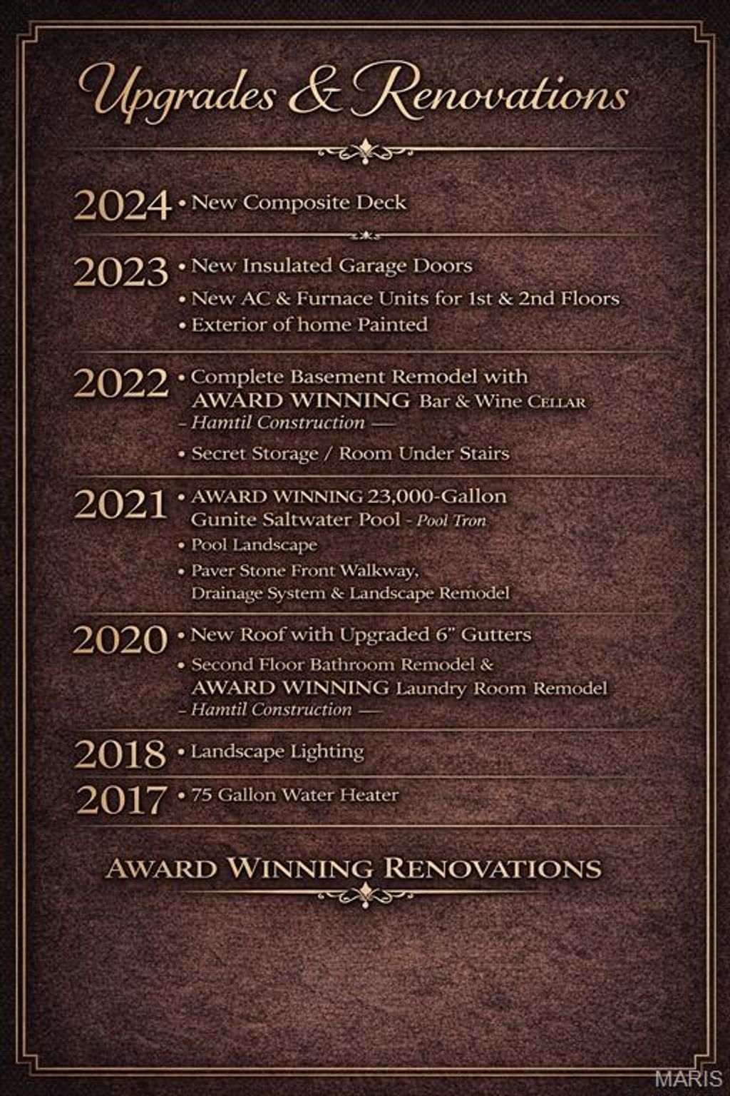 ***ACTIVE ON THE 2ND. SHOWINGS BEGIN WEDNESDAY THE 4TH.*** Located in the prestigious Wildhorse subdivision, this exceptional home offers over 6,089 square feet of finished living space on a private, over half-acre lot, quietly tucked into a cul-de-sac within the highly sought-after Chesterfield Elementary School boundaries. Designed for both everyday living and unforgettable entertaining, the home backs to mature trees and showcases an award-winning 23,000-gallon gunite saltwater pool featuring thoughtfully designed in-pool and exterior seating that face one another"”creating a truly unique social experience. A circular seating area with umbrella anchors the poolscape, while the new composite deck (2024) includes waterproofing below and a comfortable lower-level seating area, allowing outdoor enjoyment rain or shine. Inside, the home blends warmth and sophistication with multiple award-winning renovations throughout. The main floor features a large primary suite with a luxury spa-like bath, a large yet cozy kitchen, and a perfect hearth room setting ideal for gathering. Upstairs offers three generously sized bedrooms connected by a Jack-and-Jill bathroom, while dual staircases provide seamless flow and functionality. The completely remodeled lower level impresses with an award-winning bar and wine cellar, a hidden storage room under the stairs, and exceptional space for entertaining or relaxing. Major updates include newer AC and furnace units for both floors, newer insulated garage doors, exterior paint, and a newer roof with upgraded 6" gutters, along with an award-winning laundry room remodel. Beyond the home, Wildhorse offers resort-style community amenities, including two pools with lifeguards, two sets of tennis, pickleball, and basketball courts, three scenic lakes allowing fishing, and beautiful wooded walking trails. Set within a family-friendly neighborhood with an active community of children, this home delivers a rare blend of luxury, privacy, lifestyle, and livability in one of Wildwood's most desirable communities.