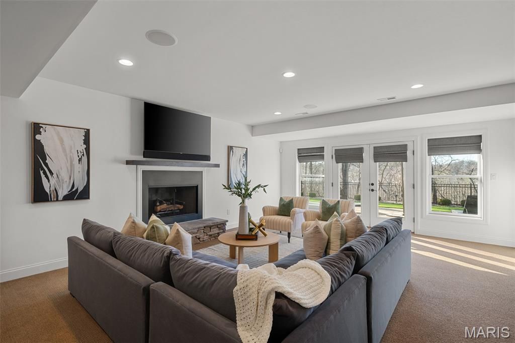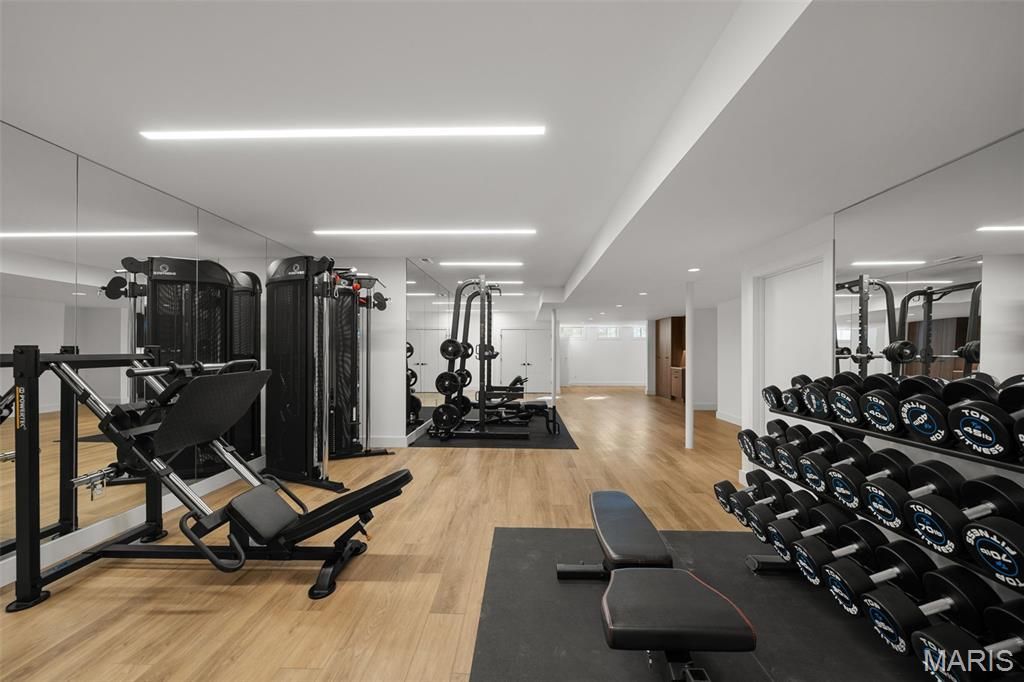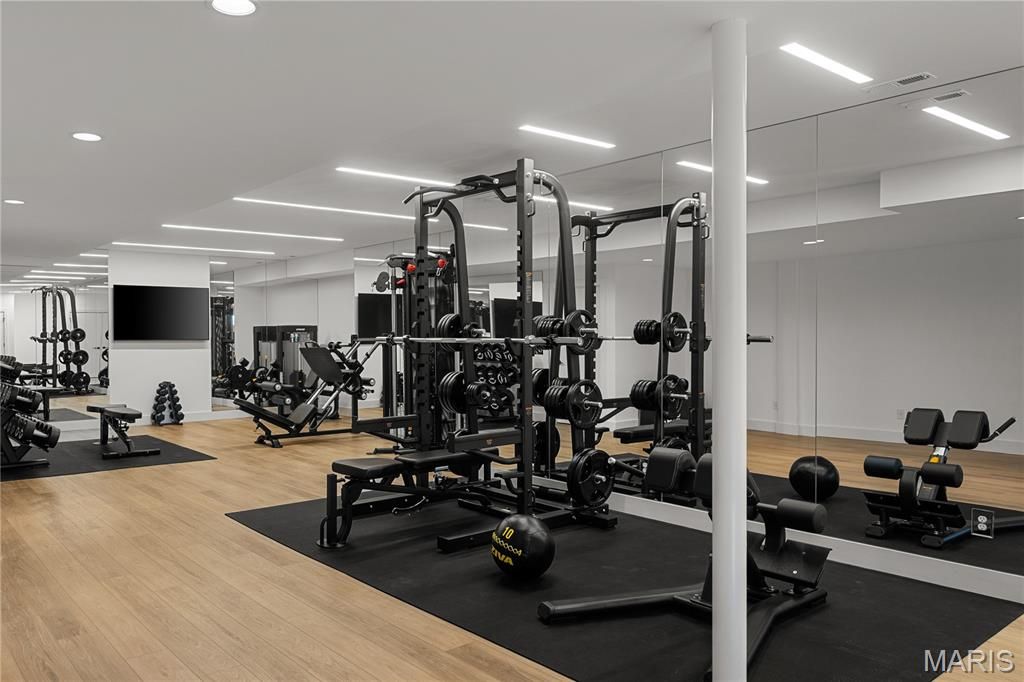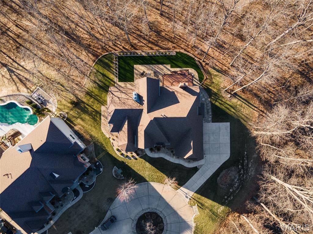 Prestigious homes in this highly coveted Chesterfield neighborhood rarely come to market, and this one is extraordinary. Nestled at the quiet end of a private cul-de-sac, this stunning contemporary estate at 1401 Fox Hill Farms Court spans nearly 7,900 square feet of living space across 1.5 stories offering the rare combination of seclusion, sophistication, and effortless luxury that discerning buyers wait years to find. Imagine waking each morning to panoramic views of rolling hills and mature woods. The main floor is thoughtfully crafted for both everyday living and grand entertaining, anchored by a chef's kitchen with an oversized island and sun-filled breakfast room that opens to a hearth room with a cozy fireplace. A gracious dining room, two half-baths, and a sophisticated wet bar make hosting effortless. For those who work from home, the main-floor office is a showstopper in its own right with soaring 12-foot ceilings and an abundance of natural light which make it as inspiring as it is functional. The primary suite completes the main level as a serene retreat, featuring coffered ceilings, built-ins, an oversized walk-in closet, spacious walk-in shower, soaking tub, and generous double vanities. Upstairs, three private en-suite bedrooms each offer large walk-in closets with custom systems and the kind of thoughtful storage rarely found at this level. The fully finished walk-out lower level is a world unto itself complete with a private entrance, full in-law or guest suite, spacious family room, wet bar, wine cellar, and a 56' x 30' top-of-the-line gym that rivals any high-end facility. No membership required. The home is equipped with a premium sound system as well as comprehensive home automation which can be controlled remotely, plus a backup generator for peace of mind. With five suites, seven baths, three fireplaces, a three-car garage, and nearly an acre of wooded privacy, this estate delivers on every level. Beyond the front door, you're living in one of West County's most sought-after communities and tucked away from the bustle, yet minutes from Chesterfield's premier dining, shopping, and recreation. This is more than a home. It's a lifestyle.