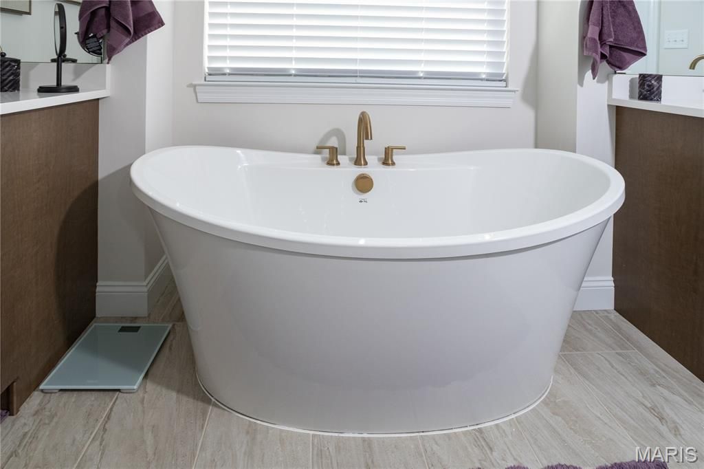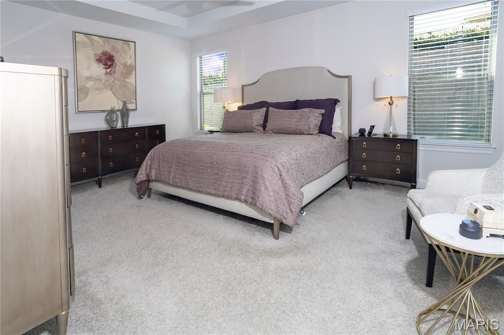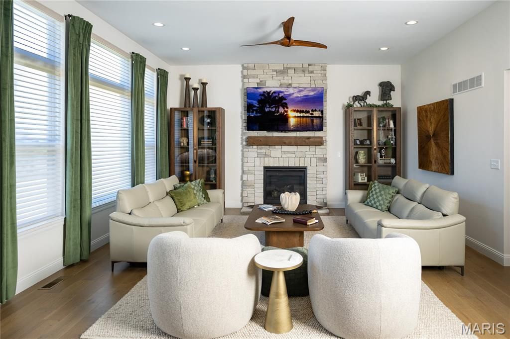 Luxurious, impeccably maintained, and designed for both everyday comfort and elegant entertaining. This stunning home features a chef's kitchen with stainless steel appliances, double ovens, soft-close cabinetry with roll-out drawers, and an oversized island perfect for gathering. The living room is anchored by a dramatic floor-to-ceiling stone gas fireplace with electric start, complemented by a picture window and remote-controlled window shades that flood the space with natural light. The primary suite is a true retreat, offering walk-in closets and a spa-inspired bath with a walk-in shower with seat, garden tub, and dual separate vanities. Additional bedrooms also feature walk-in closets, while updated light fixtures add a modern, refined touch throughout. Outside, enjoy a professionally manicured lawn with sprinkler system, landscape lighting, and a picturesque retaining wall enhancing the home's curb appeal. The finished, insulated garage adds comfort and functionality. Every detail has been thoughtfully curated; this home is move-in ready and waiting for the perfect family to call it home.