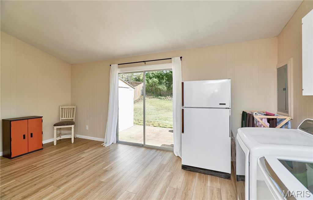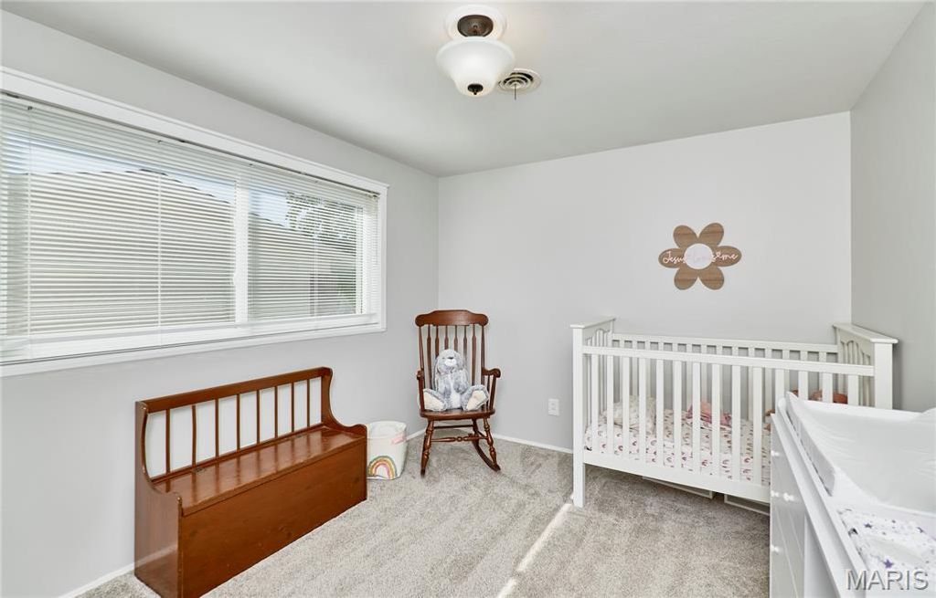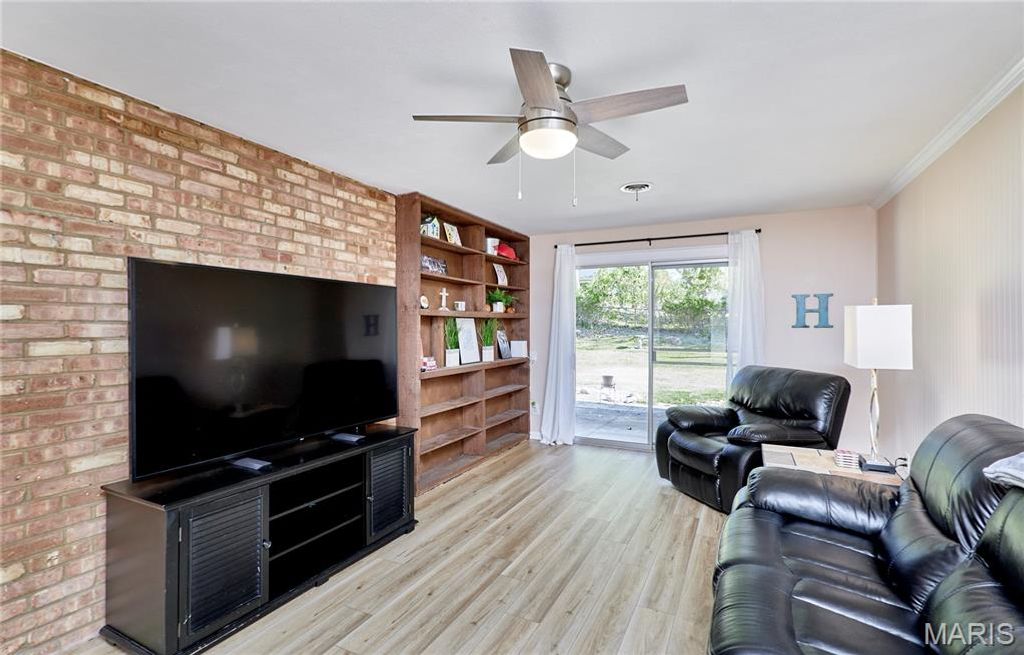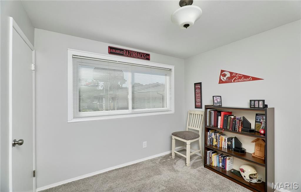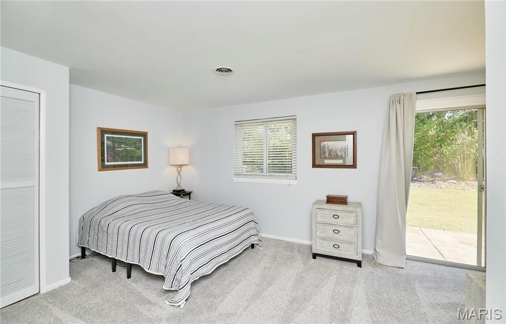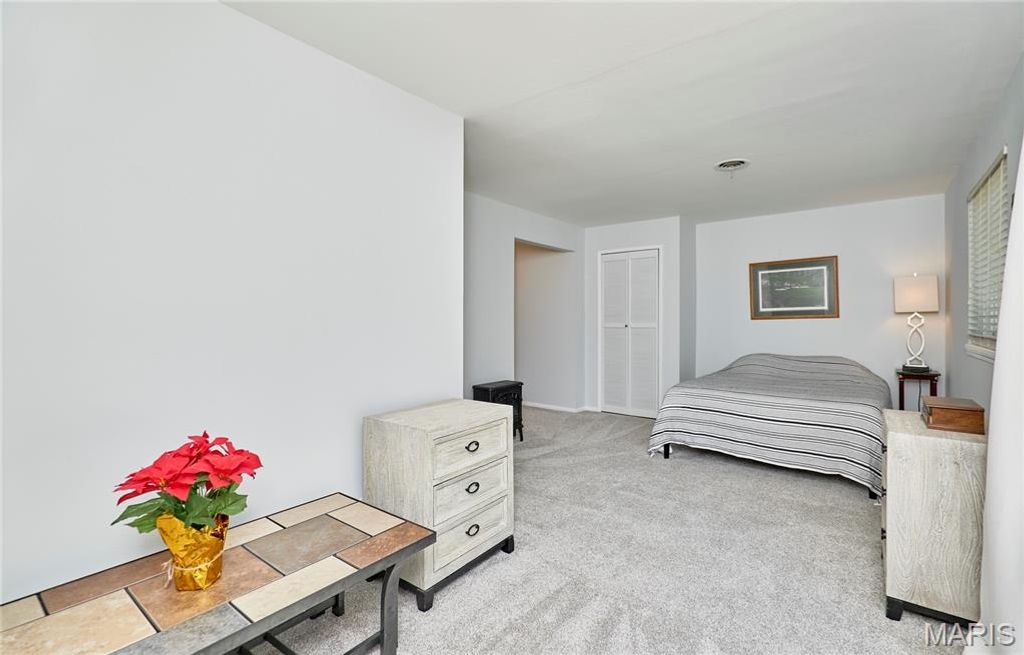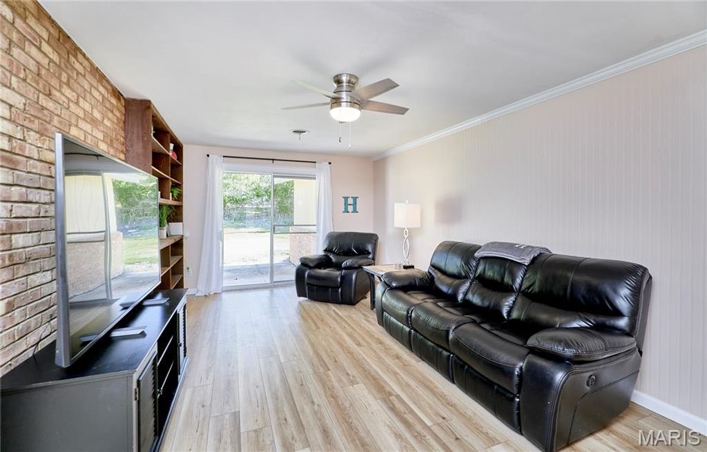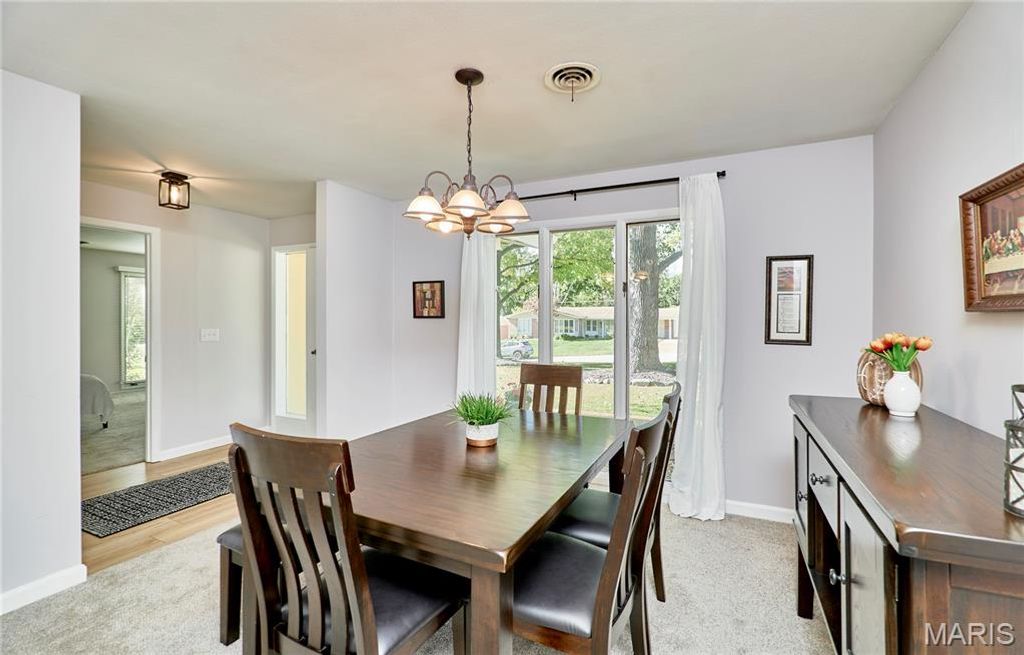 BEAUTIFUL MID CENTURY VIBE! The perks of owning a home with no basement is you get over 2100 square feet of easy living all on one floor! Situated in beautiful Ballwin, Parkway West School District, Shopping, Restaurants and easy access everywhere! This is a true four-bedroom, two full bath home. The large living room shows as an extra bedroom but it can also work great for a sunlit office/flex or play room. Large laundry/mud/bonus room with slider to rear yard has so much potential as well. Updated eat-in kitchen has ample cabinets/pantry area. The primary bedroom has new carpet, an updated bath, walks out to the rear yard, and multiple closets. Light and bright everywhere you turn, neutral decor, usable fenced rear yard, two-car extra deep garage with extra storage and built-in shelves, . This wonderful home sits on a very friendly cul-de-sac!