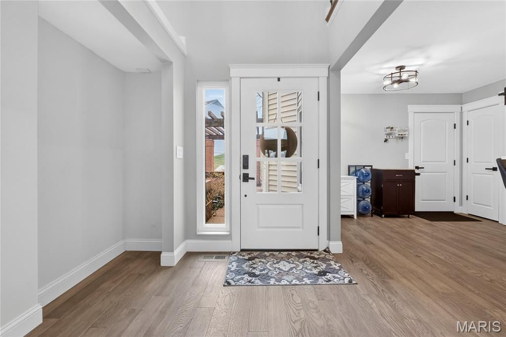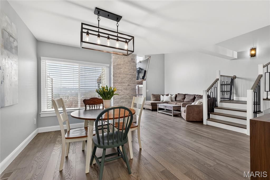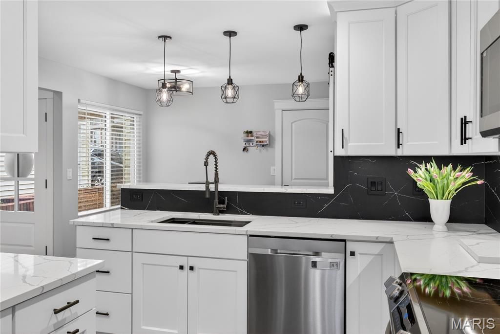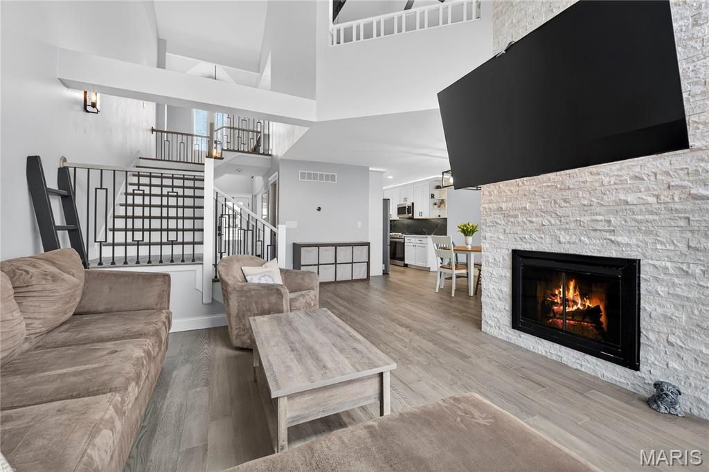 Homes like this are the ones buyers wait for, fully renovated, beautifully designed, and perfectly located in the heart of Ballwin within the highly sought-after Parkway School District. With quick access to major highways, restaurants, shopping, and everyday conveniences, the location offers the perfect balance of accessibility and peaceful living. Step inside and you're immediately welcomed by soaring vaulted ceilings, natural light, and an open, airy layout that makes the home feel both spacious and inviting. The dramatic great room features a striking stone wood-burning fireplace and large windows that frame scenic wooded views, creating a warm and comfortable space to relax or gather with friends and family. The fully renovated kitchen blends modern style with everyday functionality. Custom soft-close cabinetry, quartz countertops, stainless steel appliances, sleek black tile backsplash, and a deep single-basin sink create a clean, sophisticated look. The peninsula offers casual seating and an easy place to gather, while thoughtful lighting and finishes elevate the entire space. Upstairs, the vaulted primary suite offers a peaceful retreat filled with natural light. The spa-inspired bath features heated tile floors, a dual vanity, skylight, private water closet, and a custom walk-in tile shower. A second vaulted bedroom includes its own en-suite bath, and second-floor laundry adds everyday convenience. The finished walk-out lower level expands the living space with LVP flooring, a spacious family room, third bedroom with walk-in closet, and a beautifully renovated full bath, perfect for guests, a home office, or additional living space. Step outside to the covered composite deck where you can enjoy quiet mornings, evening sunsets, and peaceful wooded views. Residents also enjoy access to the neighborhood community pool, adding to the lifestyle this wonderful community offers. Nearly every component of the home was updated in 2024, including a full electrical rewire, new plumbing, HVAC, water heater, appliances, flooring, drywall, kitchen, bathrooms, and lighting. Fully move-in ready and thoughtfully renovated from top to bottom, this home offers modern comfort, beautiful design, and an unbeatable location. Don't miss out!