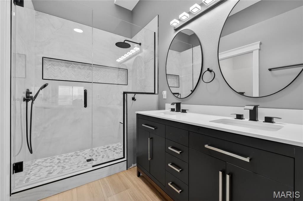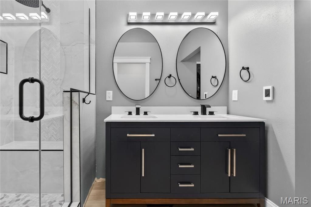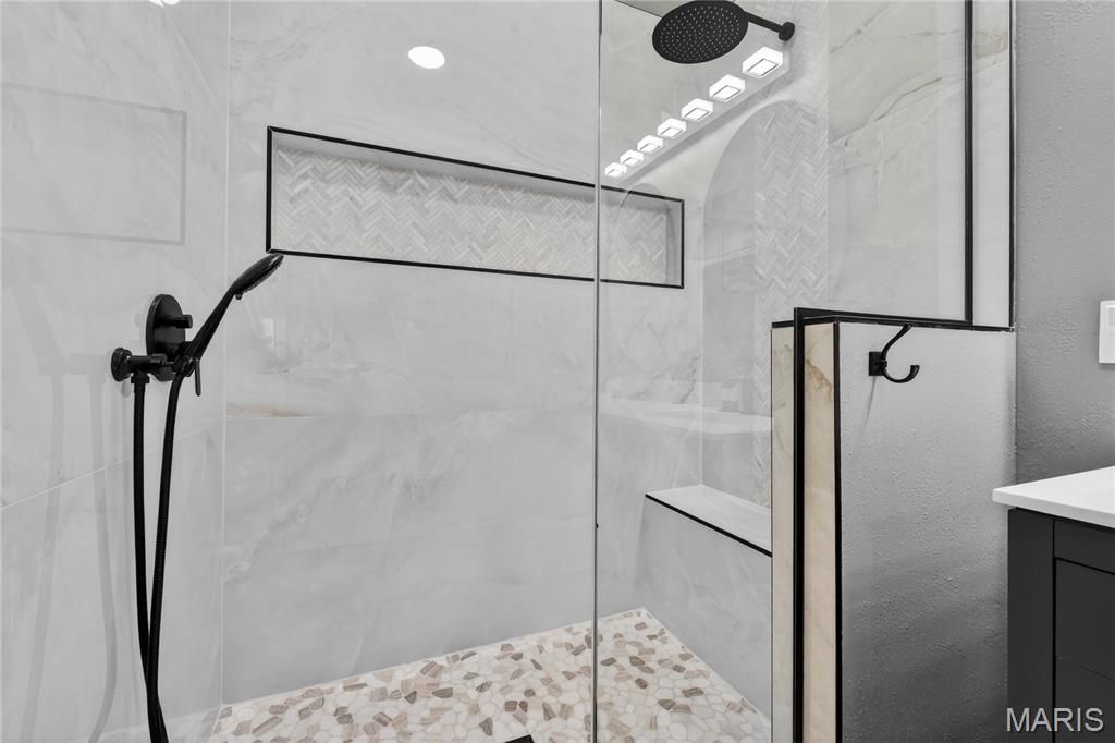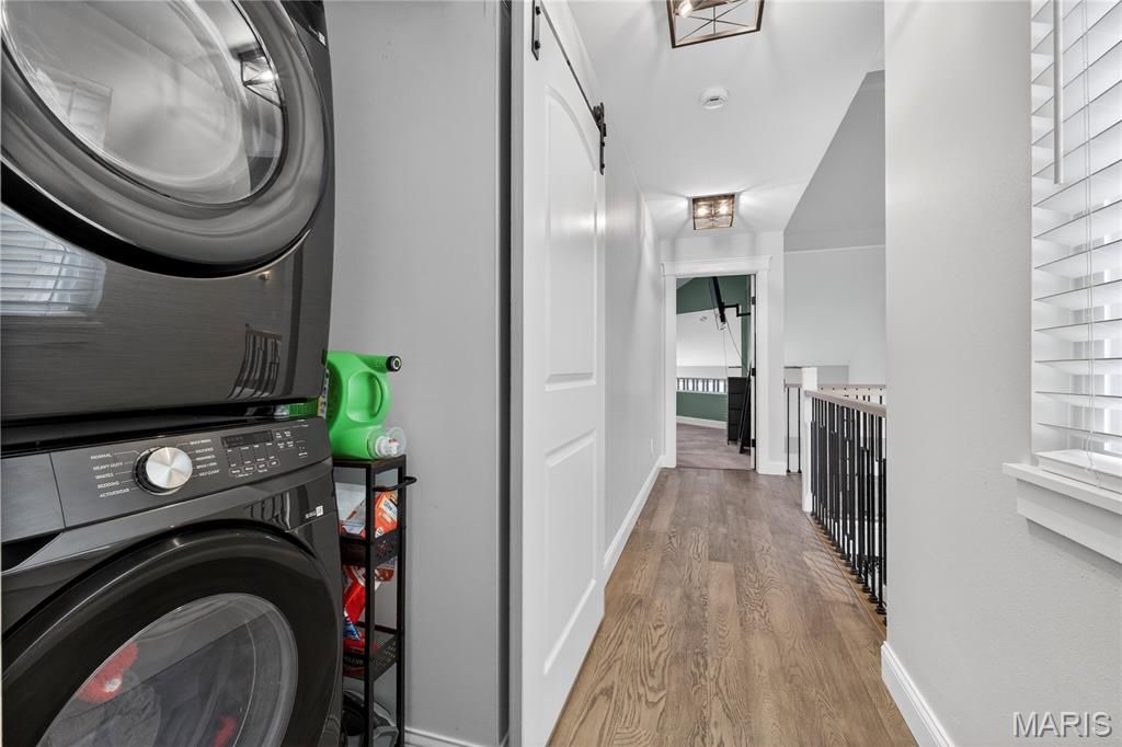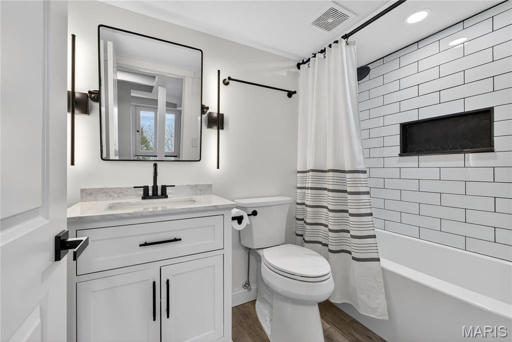 Homes like this are the ones buyers wait for, fully renovated, beautifully designed, and perfectly located in the heart of Ballwin within the highly sought-after Parkway School District. With quick access to major highways, restaurants, shopping, and everyday conveniences, the location offers the perfect balance of accessibility and peaceful living. Step inside and you're immediately welcomed by soaring vaulted ceilings, natural light, and an open, airy layout that makes the home feel both spacious and inviting. The dramatic great room features a striking stone wood-burning fireplace and large windows that frame scenic wooded views, creating a warm and comfortable space to relax or gather with friends and family. The fully renovated kitchen blends modern style with everyday functionality. Custom soft-close cabinetry, quartz countertops, stainless steel appliances, sleek black tile backsplash, and a deep single-basin sink create a clean, sophisticated look. The peninsula offers casual seating and an easy place to gather, while thoughtful lighting and finishes elevate the entire space. Upstairs, the vaulted primary suite offers a peaceful retreat filled with natural light. The spa-inspired bath features heated tile floors, a dual vanity, skylight, private water closet, and a custom walk-in tile shower. A second vaulted bedroom includes its own en-suite bath, and second-floor laundry adds everyday convenience. The finished walk-out lower level expands the living space with LVP flooring, a spacious family room, third bedroom with walk-in closet, and a beautifully renovated full bath, perfect for guests, a home office, or additional living space. Step outside to the covered composite deck where you can enjoy quiet mornings, evening sunsets, and peaceful wooded views. Residents also enjoy access to the neighborhood community pool, adding to the lifestyle this wonderful community offers. Nearly every component of the home was updated in 2024, including a full electrical rewire, new plumbing, HVAC, water heater, appliances, flooring, drywall, kitchen, bathrooms, and lighting. Fully move-in ready and thoughtfully renovated from top to bottom, this home offers modern comfort, beautiful design, and an unbeatable location. Don't miss out!