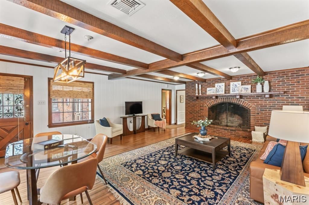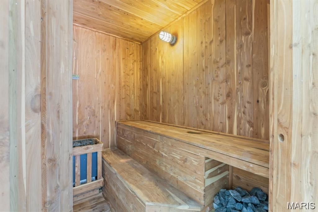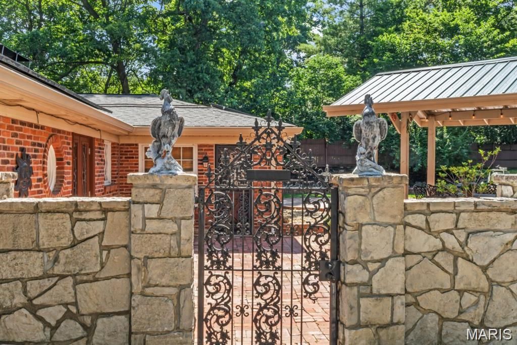 Set on a beautifully private 1-acre wooded lot, this distinctive ranch-style home offers true single-level living paired with an exceptional outdoor retreat. Elevated within the neighborhood, the property enjoys a rare sense of privacy with no direct sightlines into the home or backyard. Inside, the residence blends classic architectural character with comfortable modern updates. Formal living and dining rooms feature elegant trim details, while a spacious family room with built-ins and dual fireplaces creates a warm and inviting gathering space. The split-bedroom layout offers privacy, and the vaulted primary suite includes a walk-in closet and a beautifully appointed bath featuring a steam shower and its own dedicated hot water system. The outdoor setting is designed for both relaxation and entertaining. A restored pool anchors the backyard, complemented by a sun-filled patio and a shaded pavilion with a suspended grill and fire feature. Just beyond, a private spa house (additional 272 sq ft) creates a true wellness retreat, complete with jacuzzi, dry sauna, steam room, and a charming cupola that echoes the architecture of the main home. Additional highlights include zero-step access throughout the home for easy mobility, a secluded courtyard, and solar panels that help offset energy costs. The expansive one-acre lot provides both space and seclusion while remaining conveniently located. Positioned next to Covenant Seminary and minutes from schools including CBC, The Priory, Visitation, and Principia, as well as Maryville and Missouri Baptist University, the home also offers quick access to Mercy and Missouri Baptist medical campuses. A rare opportunity to enjoy privacy, character, and resort-style living on a full acre in one of the area's most convenient locations.