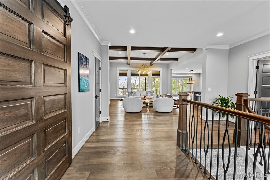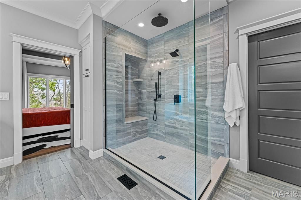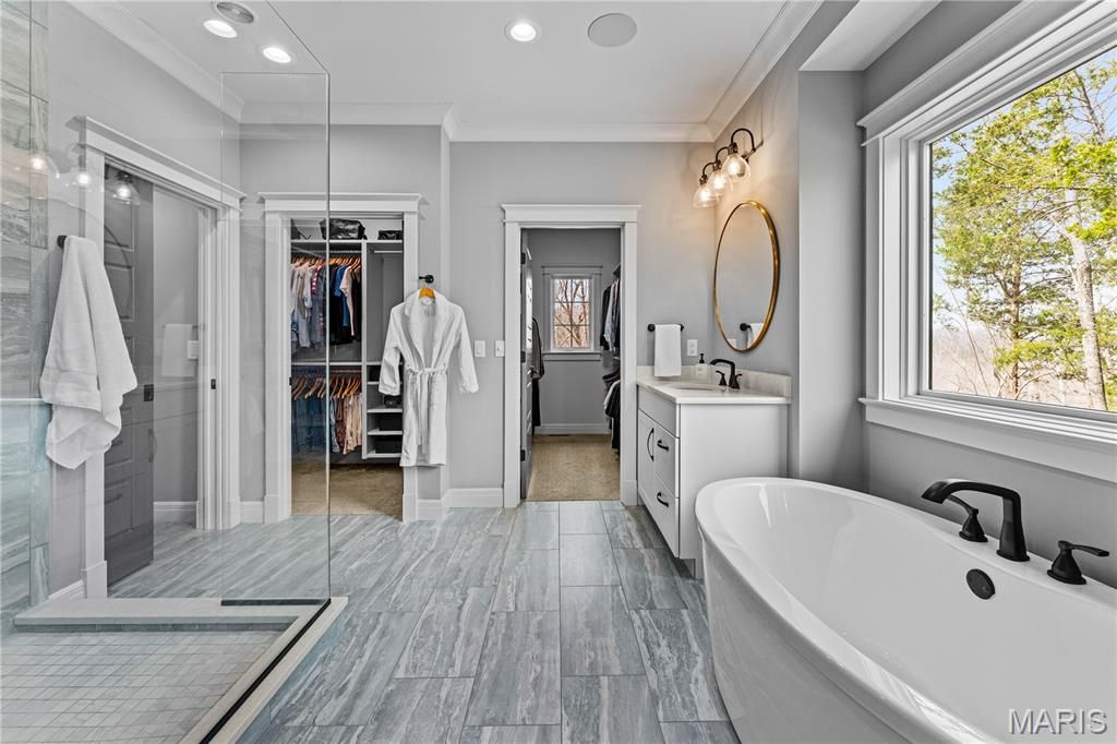 A secluded retreat centered around wellness, comfort, and relaxation. Set on three private acres, this property's hallmark feature is a custom saltwater pool with an infinity edge that can be both heated and chilled. Gorgeous hardwood floors and fine moldings throughout the main living areas make this home a designer showcase. The main level features an open layout where the kitchen, dining, and great room with gas fireplace connect seamlessly, framed by large windows overlooking the wooded backdrop. The kitchen offers a generous island, professional-grade appliances, custom cabinetry, large bar, walk-in pantry with Costco door and quartz counters. The primary suite is a private retreat with dual walk-in closets, a spa-like bath with a soaking tub, a multi-head shower, a Toto smart toilet, and access to a covered deck. An additional bedroom suite, laundry room, and an office complete the main level. The walk-out lower level has two additional bedrooms, a full bath, and a recreation room with a wet bar. The spa-like feel continues with a well-appointed exercise room including an infrared sauna. This is a complete smart home operated by your phone to simplify everyday living. The three-car garage includes a Tesla charger. Upgraded insulation and energy-efficient systems. In-ceiling speakers throughout the home and deck, a whole-house 24 kW generator, and irrigation system make this an ideal property.