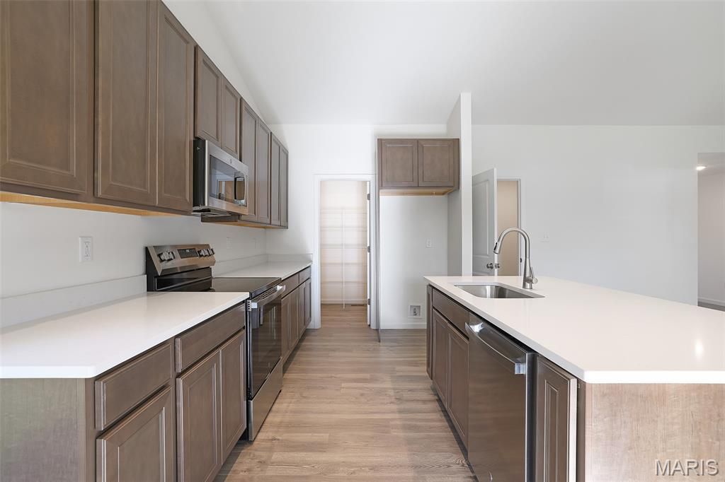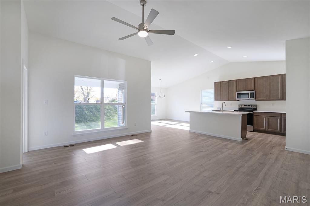 McBride Homes' Aspen II 3BR, 2BA ranch home is ready this summer! Enjoy an open floorplan with vaulted ceilings, 6' windows, & beautiful wood laminate flooring in main living areas. The kitchen has a large island w/breakfast bar, level 4 Winstead Burlap 42" cabinets, quartz countertops, stainless steel GE appliances, & a large walk-in pantry. The dining area has a sliding glass door to a future covered patio area with a ceiling fan prewire. The primary suite has a large window, dual closets & a private bath with double sinks & a walk-in shower. Two additional bedrooms & full bathroom add convenience. Extras include main floor laundry, ¾ bath rough in the lower level, matte black fixtures, 2 panel white interior doors, plus a 2-car garage w/coach lights. Boulevard at Wilmer Valley amenities include a playground, covered pavilion, gazebo walking trails and common ground. Enjoy peace of mind with McBride Homes' 10yr builders' warranty & incredible customer service! Similar photos shown.