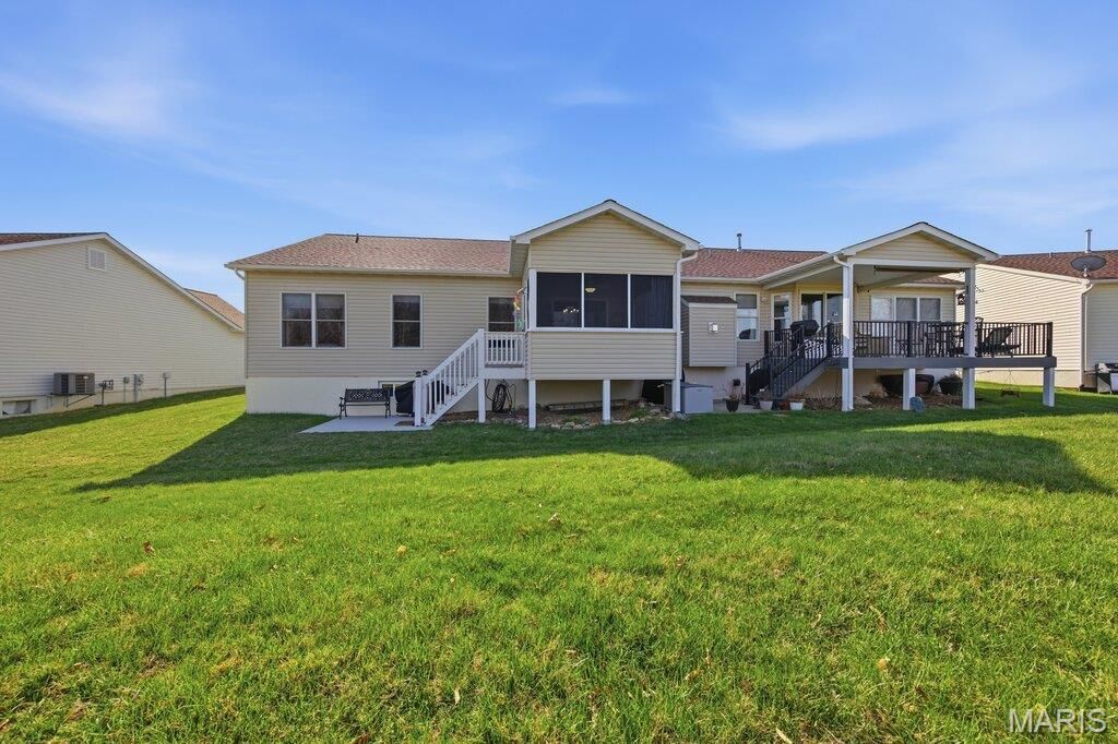Welcome to the Golf Club of Wentzville Villas and this beautifully maintained 2-bedroom, 3-bath home that showcases true pride of ownership throughout. The heart of this home features an open concept living area defined by soaring vaulted ceilings and large windows that bathe the room in natural light. A stunning kitchen with gleaming granite countertops, a classic subway tile backsplash, and stainless steel appliances. Enjoy relaxing or entertaining on the screened-in back deck with views of the 18th fairway, or head downstairs to the fully finished basement complete with a wet bar, living room, additional sleeping area or office, a full bath plus ample storage area. Additional highlights include custom built-in shelving around the electric fireplace in the main floor living room, main-floor laundry, and the ease of maintenance-free living. Tucked just off the beaten path in Wentzville, this home offers the perfect blend of comfort, style, and convenience"”Don't miss your chance to see this gem in person at the Open House Sunday March 29th from 12PM-2PM.