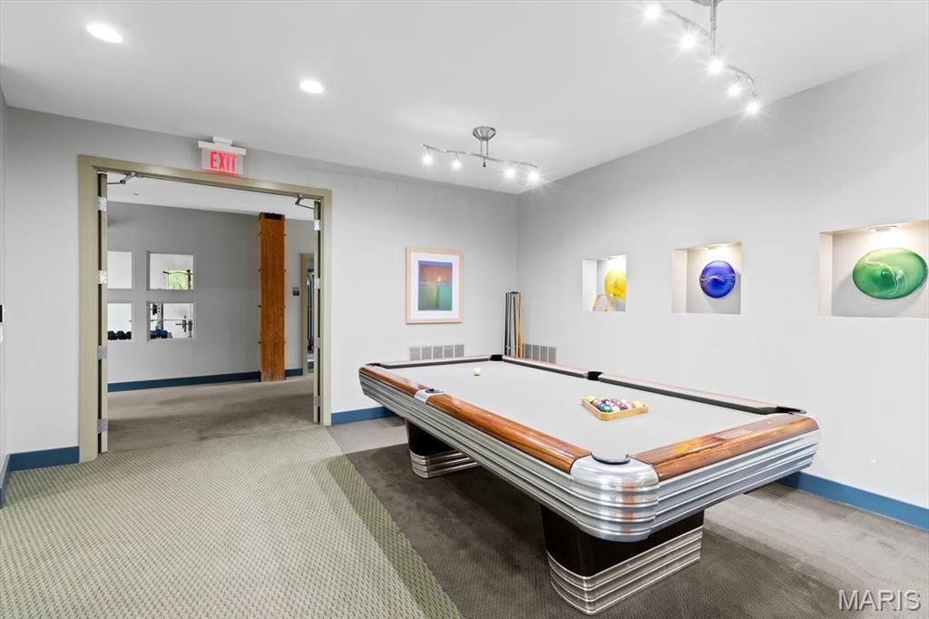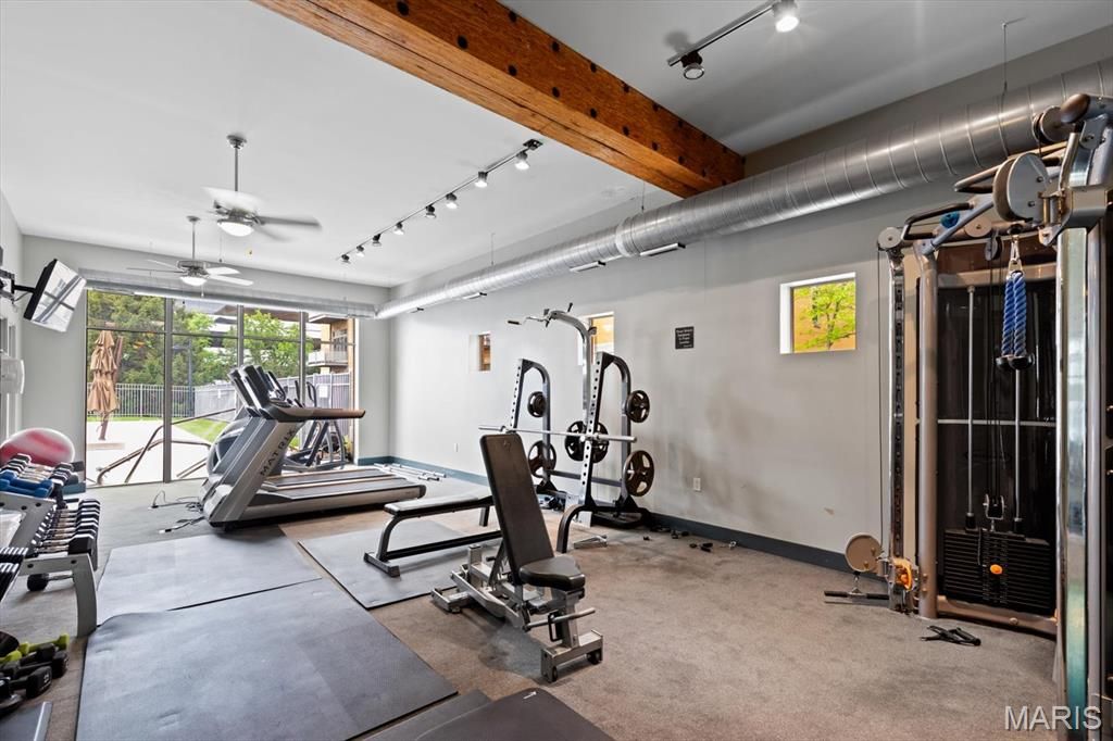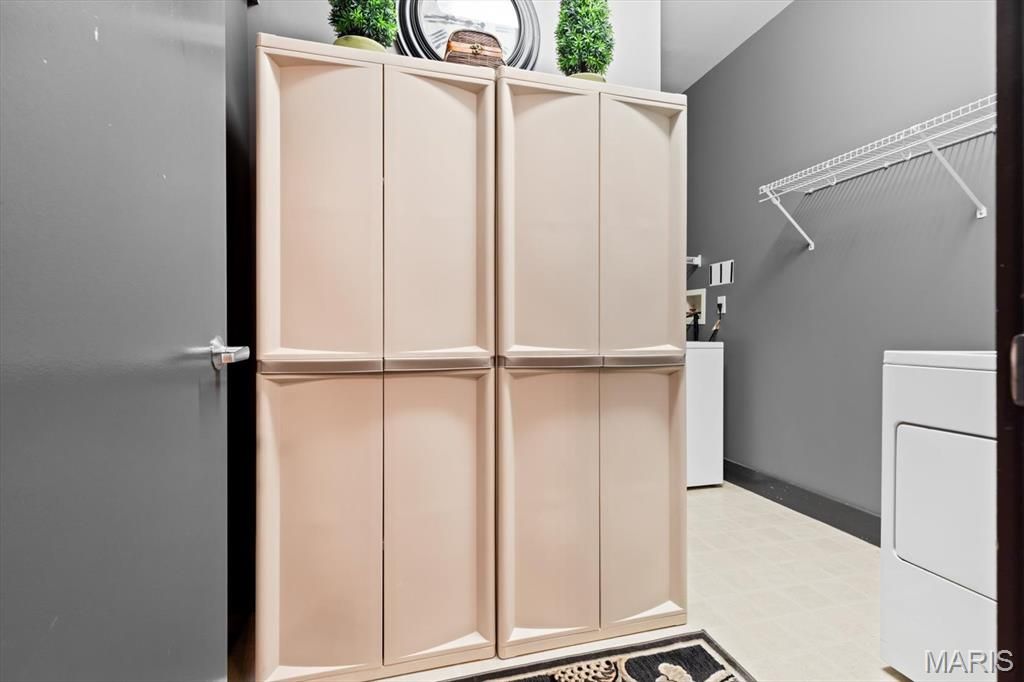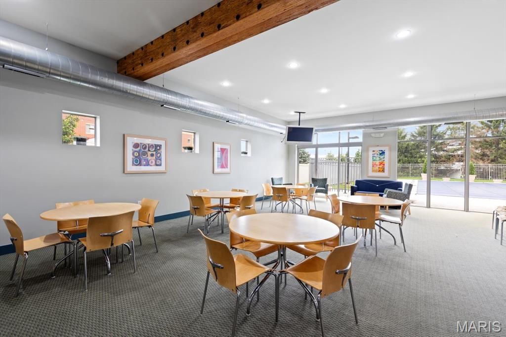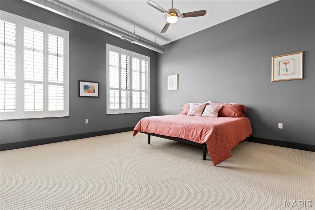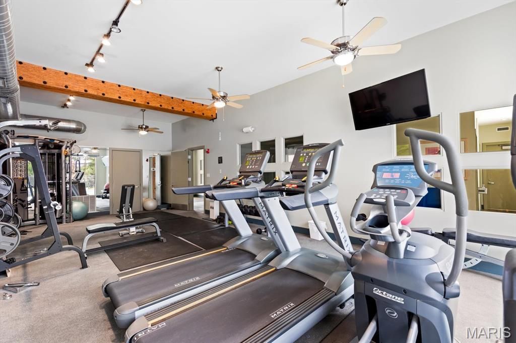 Experience the perfect synthesis of industrial-chic sophistication and tranquil suburban luxury in this extraordinary 4th floor condo. Nestled in the heart of Creve Coeur at the pivotal intersection of I-270 and Olive, this residence offers a calm and peaceful sanctuary. This location is a dream, positioned just moments from elite medical centers including Barnes-Jewish West County Hospital, Missouri Baptist, and Mercy Hospital St. Louis. Additionally, the close proximity to shopping, dining, entertainment, and top-rated schools and parks makes this an enviable address for any lifestyle, along with getting everywhere fairly quickly. You are greeted by rich hardwood flooring that flows seamlessly throughout an expansive, open-concept floor plan. The soaring ceilings immediately elevate the sense of space, while dimmer switches and high-end light fixtures allow you to customize the ambiance. The entry hall and laundry room (w/d can stay!) are thoughtfully designed with abundant interior storage, ensuring that the home remains as organized as it is beautiful. The kitchen is perfectly designed for those who love to cook and entertain. It features an expansive center island with built-in electricity, an ideal hub for meal prep, casual weeknight meals, or hosting a spread for guests. The workspace is beautifully illuminated by under-cabinet lighting, highlighting the sleek stainless steel appliances (refrigerator can stay!), elegant cabinetry, and custom California Closets shelving. Whether you are a culinary enthusiast or a casual host, this open kitchen ensures you are always part of the conversation. The living room is a masterclass in character and charm. Built-in sconces add a touch of drama to the space, complementing the electric log fireplace across the room that provides both physical warmth in the winter and a flickering glow for year-round ambiance. To the left of the fireplace, a custom nook offers a versatile canvas: create your own home library, a gallery wall for fine art, or a sophisticated workspace. Architectural interest is piqued by transom windows that invite natural light to dance across the room. Step through the glass doors onto your private deck to witness the property's most breathtaking feature: a panoramic horizon view. Enjoy a sunrise coffee or a vibrant evening sunset, along with a front-row seat in July as fireworks light up the sky all the way from Chesterfield. Enter the primary suite through a stunning frosted glass door with wood accents, revealing a space that feels like a high-end urban loft. This massive retreat features incredibly tall ceilings and plantation shutters that offer the perfect balance of sunlight and privacy. Transom windows allow light to flow in from the main living area, maintaining a bright and airy feel. The primary bathroom is a spa-like escape, boasting a double vanity with extensive counter space, a tiled shower with built-in bench seat, and a large jetted tub for ultimate relaxation. Organization reaches new heights in the primary closet, which features an extensive California Closets system including dedicated hanging sections, custom drawers, and an entire section for shoe display. The 2nd bedroom is equally impressive, offering the flexibility needed for a modern lifestyle. The closet has a built-in shelving system, serving perfectly as a high-functioning home office or a welcoming guest suite. Practicality is rounded out by the laundry room across the hall. Beyond the unit, the community amenities are second to none. Residents benefit from secure building access, a sparkling swimming pool, and a dedicated picnic area with fire pit and barbecue grills. The clubhouse is the community's social heart, featuring a fitness room, and an event space equipped with a mini kitchen. The immediate area has unmatched convenience for outdoor recreation, just minutes from the 320 acre Creve Coeur Lake Park, and miles of paved trails connecting to the Katy Trail.