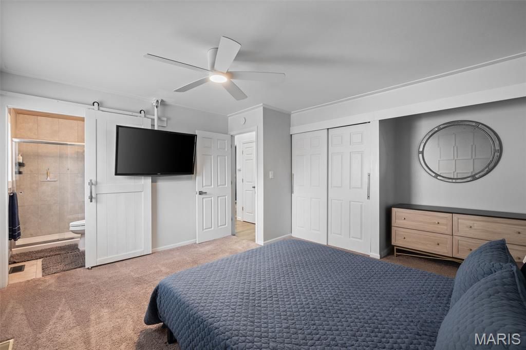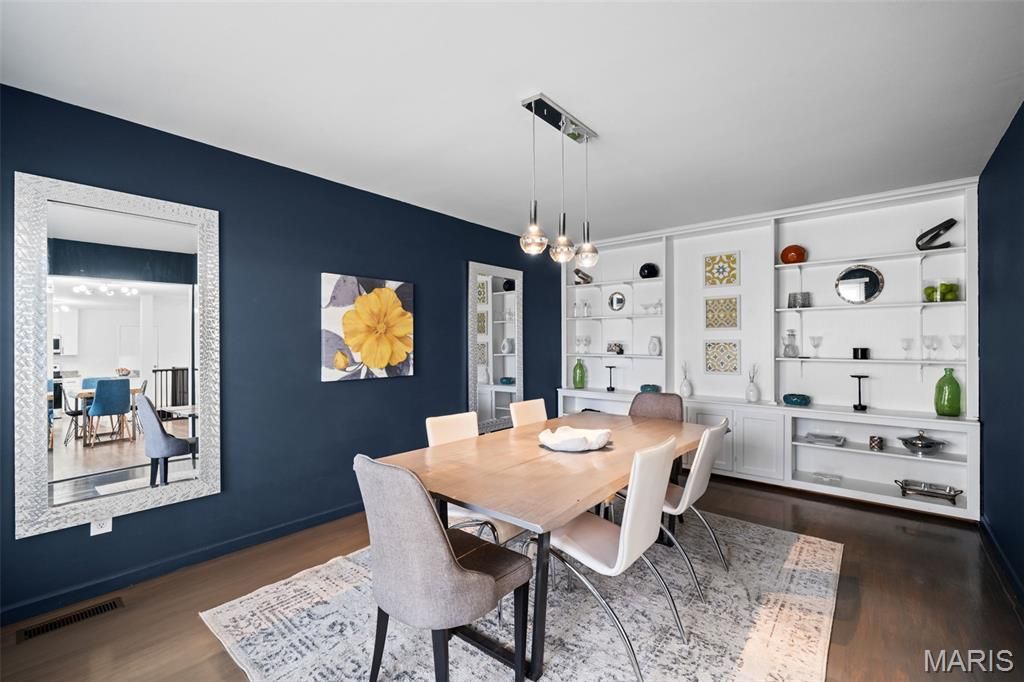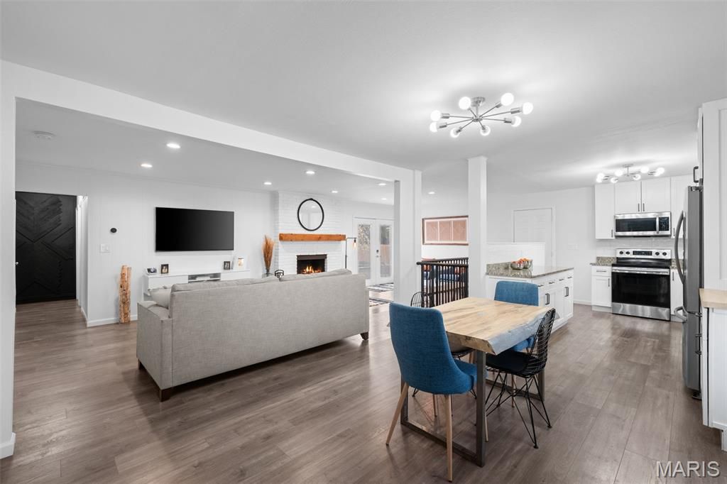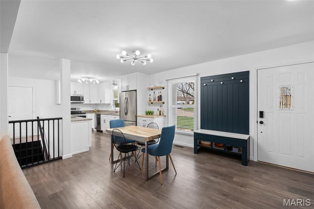 Updated 3 bed, 3 bath ranch that looks like it belongs in the pages of a design magazine! From the charming covered front porch and custom modern mailbox to the beautifully landscaped .328 acre lot, every detail hints at the style and quality you'll find inside this one-of-a-kind home. Step into an open-concept layout offering nearly 3,000 sq ft of thoughtfully designed living space, highlighted by stunning hardwoods, beautiful LVP flooring, upscale fixtures, recessed lighting, stylish accent walls, and a cohesive color palette throughout. The heart of the home is the chef's kitchen, featuring stainless appliances, white shaker cabinetry, classic subway tile backsplash, granite countertops, and a bright breakfast area that flows seamlessly into the inviting family room. A striking wood-burning fireplace creates a warm focal point, while French doors lead to an expansive rear patio perfect for indoor/outdoor living. The formal dining room showcases an incredible wall of custom built-ins & a refinished hardwood floor, and is a great flex space as your needs evolve - formal living room, playroom, home office. Main level also features three beautifully updated bedrooms, each with contemporary ceiling fans, fresh paint, and window treatments, along with two refreshed bathrooms. The spacious primary suite provides a private retreat with a luxurious en-suite bath. All bedrooms have hardwood floors under the carpeting! Continuing with the home's modern aesthetic, the lower level offers additional rec and family space, laundry, a third full bath, and a private sleeping area ideal for guests or extended stays. Out back, the oversized patio overlooks a large, private corner lot with no rear neighbors, creating a peaceful setting for morning coffee or evening gatherings. Additional highlights include an attached 2-car garage and no HOA fees. Located in a highly desirable area, you'll enjoy easy access to shopping, dining, and the scenic beauty of Ellisville's network of eight connected parks and trails. All within the highly rated Rockwood School District!