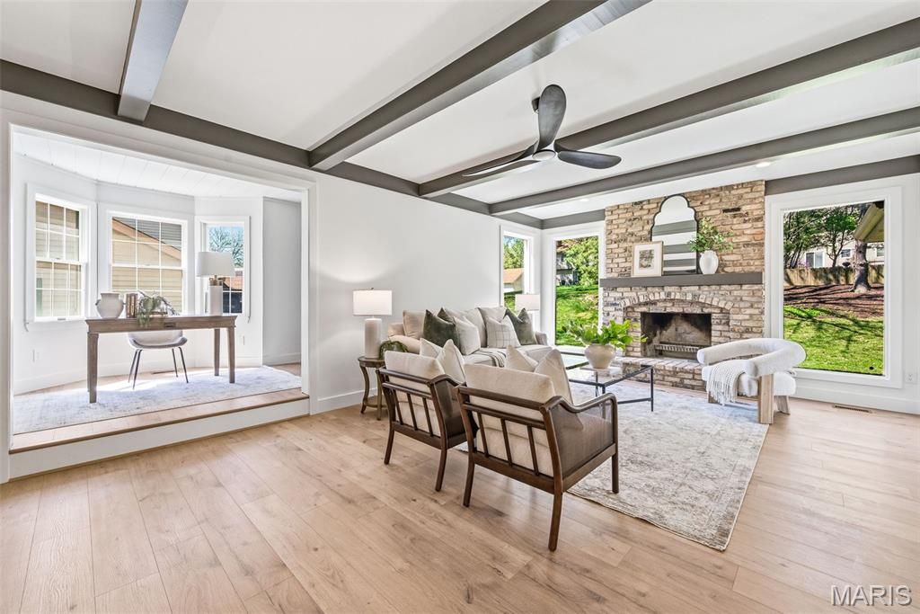Beautifully updated 4 bed, 2.5 bath 2-story on a stunning lot with mature trees and private park-like backyard. This home offers incredible curb appeal with a brick facade, inviting covered/vaulted front porch with cedar beams and stone column bases, architectural shingles, steel siding, impressive landscaping, and an oversized rear-entry garage. Enjoy outdoor living with both a covered patio, stamped patio and massive parking pad. Step inside to a fully renovated interior featuring all new luxury vinyl plank flooring, fresh paint throughout, custom moldings and trim, and designer fixtures and finishes at every turn. The kitchen has been completely transformed with custom cabinetry, rollout pantry shelving, built-in espresso bar, black stainless appliances, range hood, waterfall island, and quartz backsplash carried all the way to the ceiling. Recessed can lighting and custom wood/shiplap ceiling details elevate the space. The main floor offers a spacious living/flex room, formal dining, private office/library with bay window and built-in bookcases, and leads to a sunken family room highlighted by a beamed ceiling and floor-to-ceiling brick fireplace. Upstairs, the primary suite features double-door entry, cozy fireplace, walk-in closet and luxury bath w/ his/hers vanity and oversized shower. Additional highlights include Andersen windows, dual HVAC systems, humidifiers, 2-panel doors, and an oversized 24'10" deep garage with insulated door and service door. Located in a highly desirable area with top-rated schools and easy highway access. 2,721 sq ft of updated, move-in ready living.